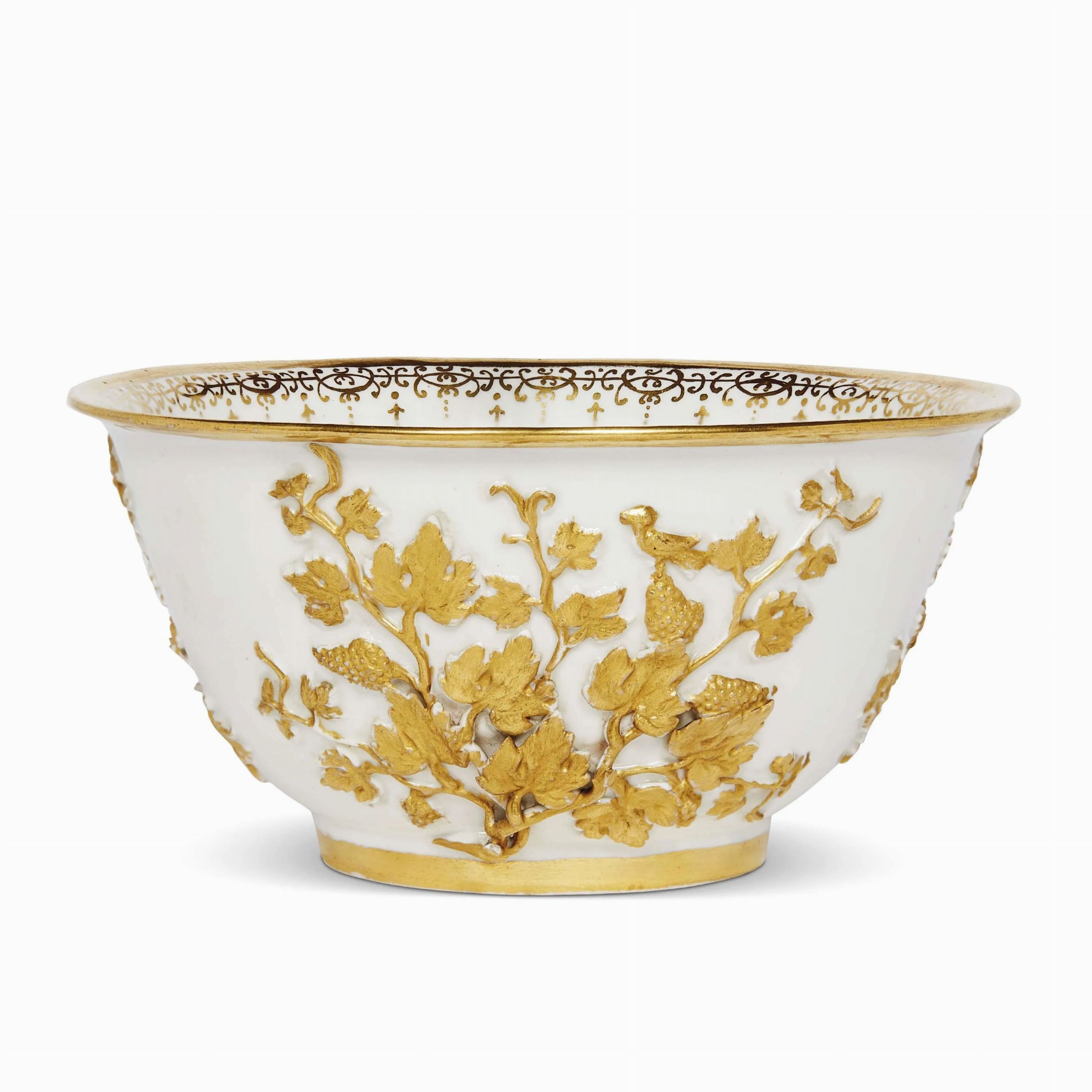in porcellana a pasta dura di forma emisferica con bordo svasato e basso piede ad anello. La superficie mostra una decorazione dorata a rilievo con un elegante motivo a tralci di uva che si allargano a partire dal tronco della vite. La doratura detta “goldspitzendekor” all’interno dell’orlo arricchisce l’ornato. Opere di porcellana sottili con decoro a rilievo furono create in manifattura da Johan Friedrich Böttger tra il 1713 e il 1725, e a tal proposito si veda il vaso con tralci di uva; alt. cm 8,4, diam. cm 16,8