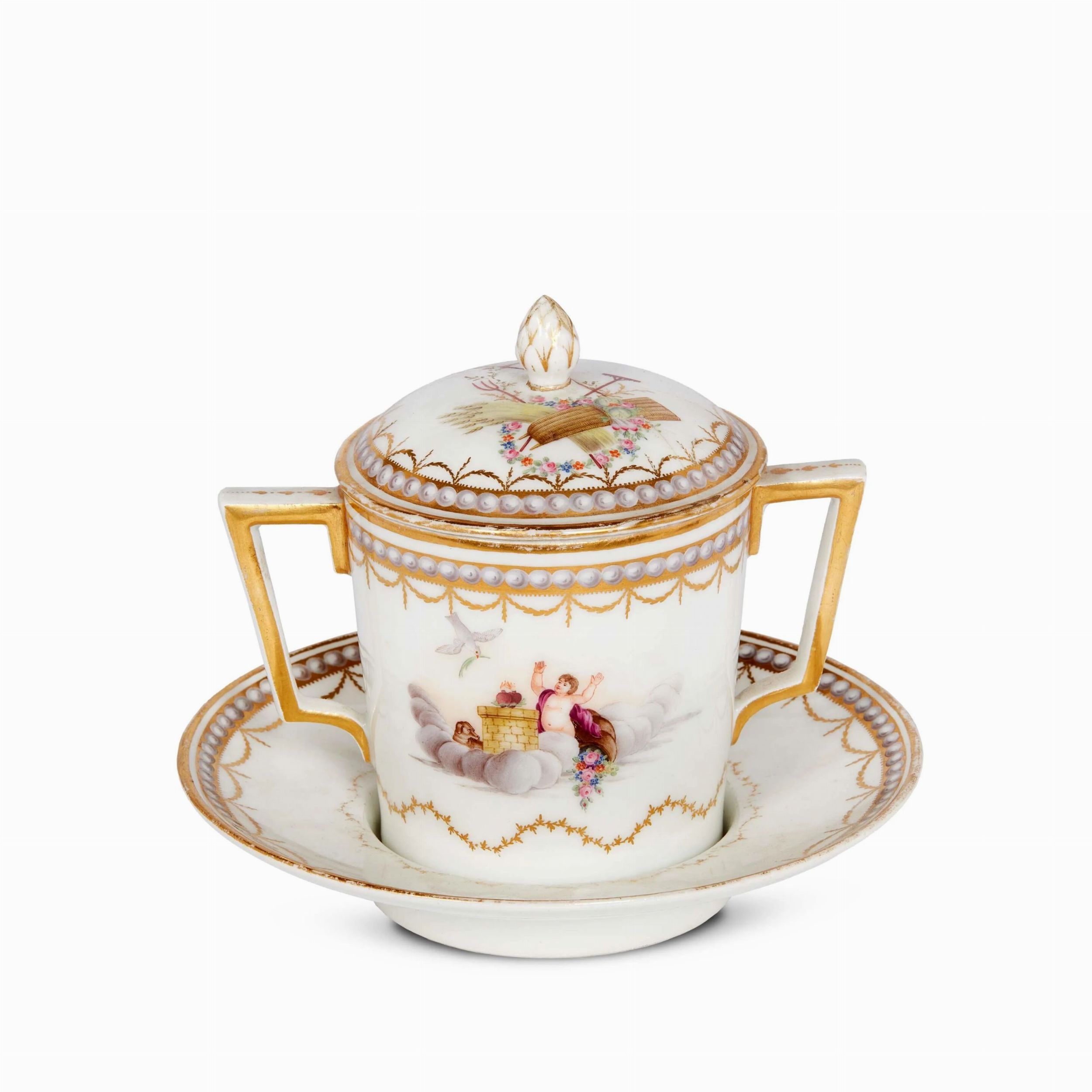 in porcellana dipinta in policromia e oro. Il contenitore ha corpo cilindrico appena svasato con doppia ansa a sezione quadrangolare e coperchio a cupola poco rilevato con presa a forma di pigna, e mostra un’elegante decorazione con allegorie legate al tema amoroso sulla fascia, elementi decorativi legati alla agricoltura sul coperchio e decori sottili a orlare le forme. Marca della manifattura in blu sul fondo; tazzina cm 12x13,5x8,5, piattino diam. cm 15,6