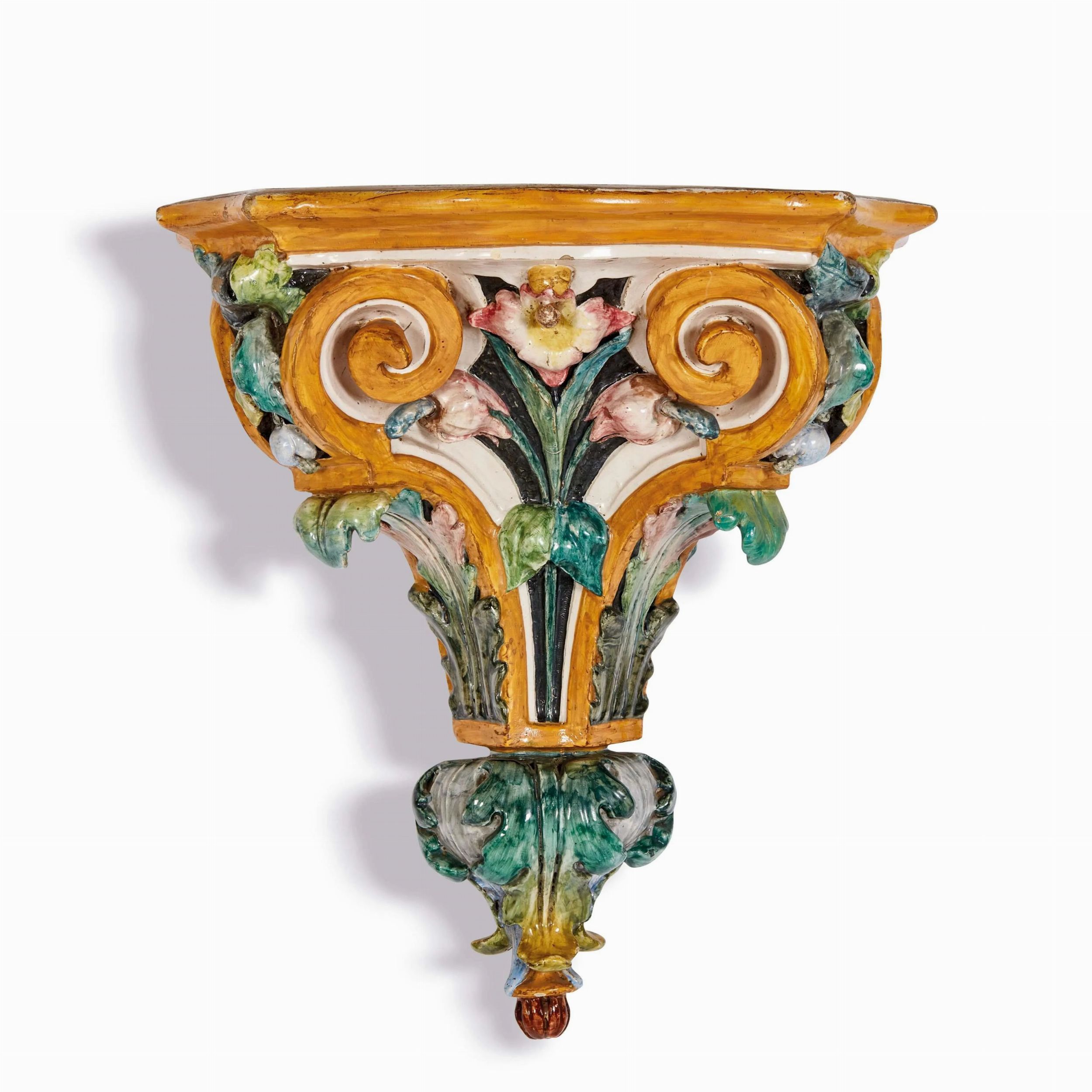 in maiolica dipinta in policromia, corpo di forma triangolare con terminale inferiore di forma piramidale sagomata. Il decoro policromo, dominato dal giallo e dal verde, sottolinea i rilievi della superficie, ed in particolare le due volute frontali e gli elementi vegetali. Data 1884 e marca della manifattura dipinte sul retro; cm 39x35,5x25