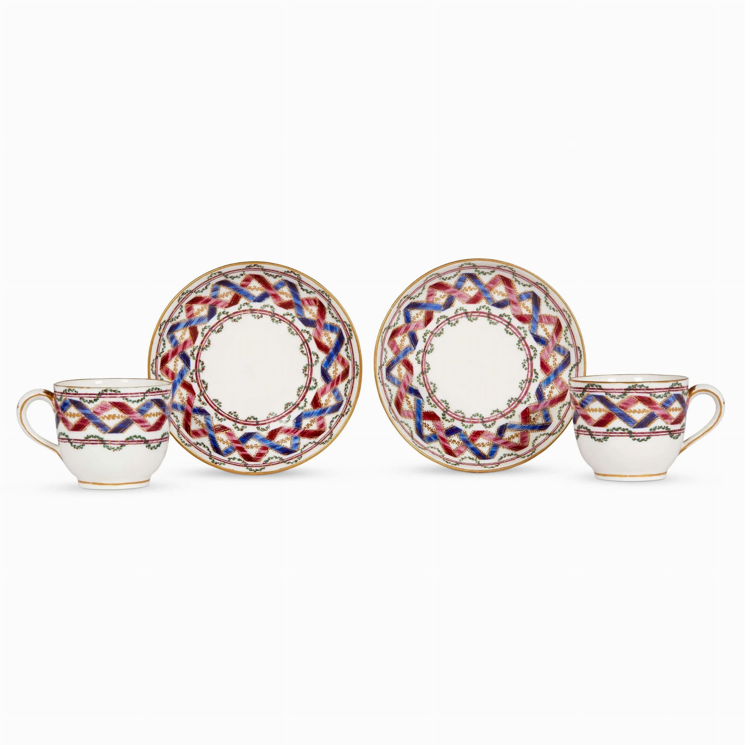 COPPIA DI TAZZINE CON PIATTINO, MANIFATTURA DI SÈVRES, 1764 in porcellana dipinta in policromia e oro, tazze a campana con un piccolo manico ad anello a sezione quadrangolare e piattino circolare. L’intera superficie mostra un decoro con intreccio simmetrico di nastri. Sul fondo marca della manifattura in blu centrata dalla lettera L per l’anno 1764 ed etichetta di provenienza SILVIA GIUSTI – ANTIQUARIATO – MILANO sul retro dei piattini; tazzina alt. cm 6, piattino diam. cm 13,4