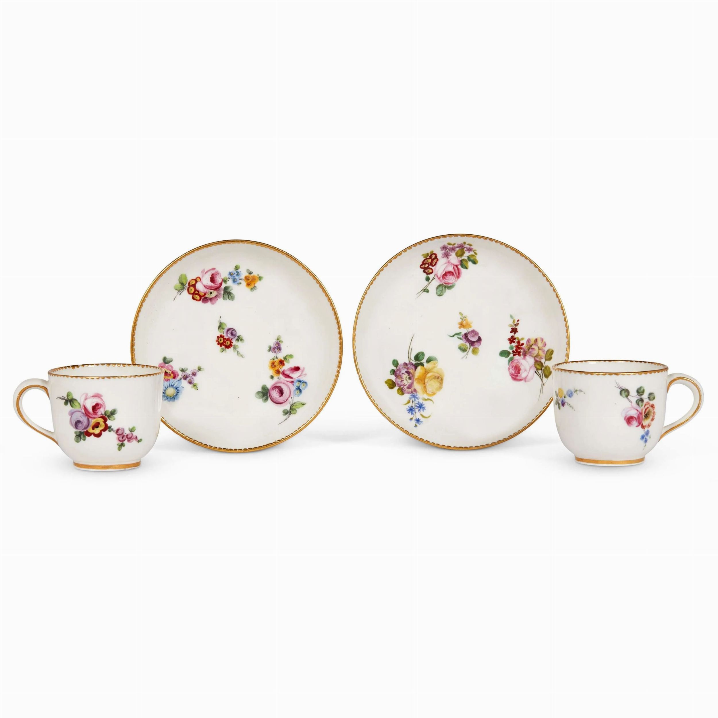 COPPIA DI TAZZINE CON PIATTINO, MANIFATTURA DI SÈVRES, 1770 CIRCA in porcellana tenera dipinta in policromia e oro, corpo a campana con piccolo manico ad anello a sezione quadrangolare e piattino circolare. L’intera superficie mostra un decoro a piccoli fiori policromi. Marca della manifattura in blu sul fondo; tazzina alt. cm 6, piattino diam. cm 13,6