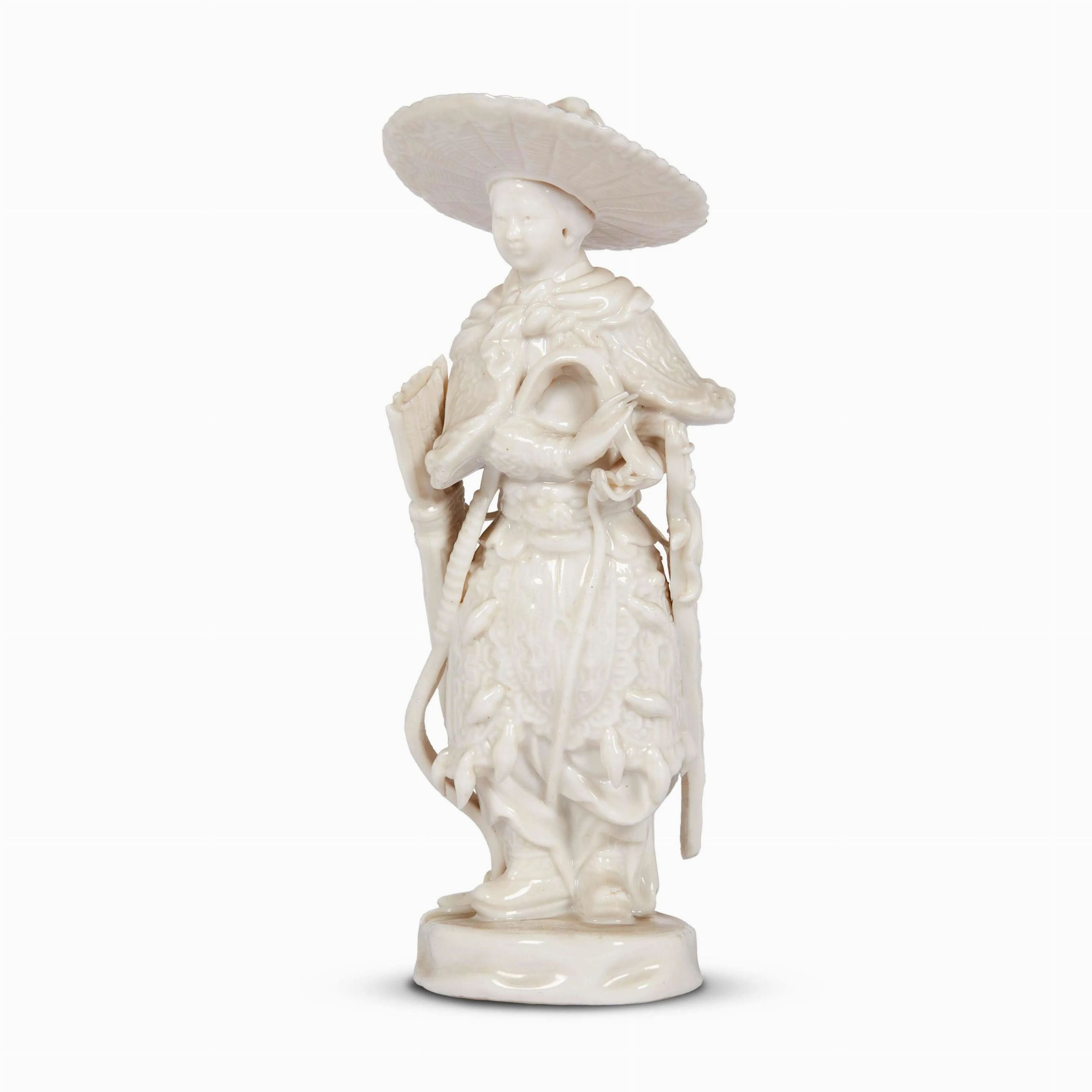 FIGURA, INGHILTERRA, 1755 CIRCA in porcellana bianca raffigurante soldato cinese armato di spada, arco e faretra, in testa un copricapo a tesa larghissima. L’assenza della marca di manifattura non permette un’attribuzione sicura, anche se le caratteristiche tecniche e stilistiche portano a pensare alle manifatture inglesi di Derby o Bow; alt. cm 15,5