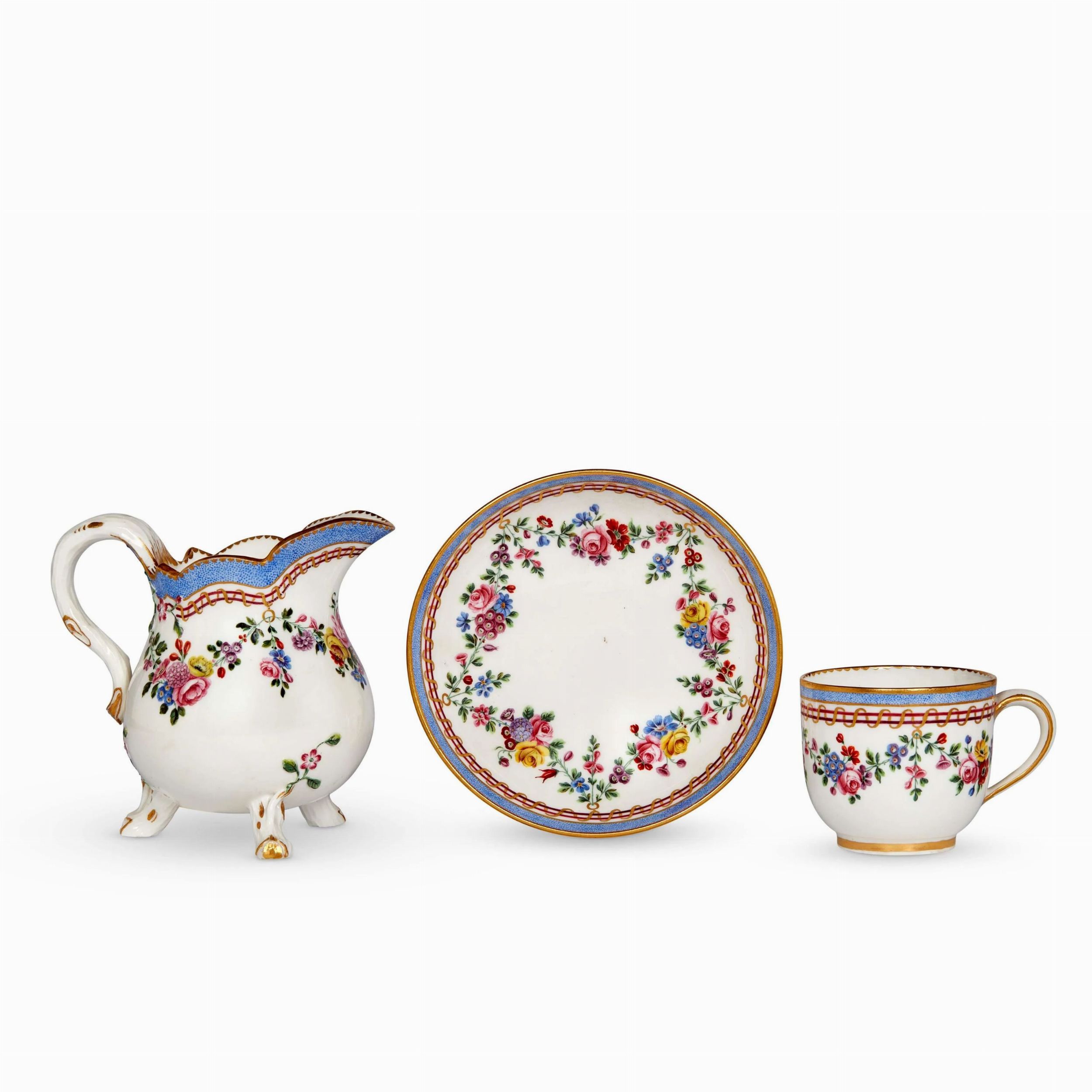 in porcellana dipinta in policromia e oro, tazza a campana con ansa ad anello e piattino coerente e lattiera a corpo globulare su piedini rocaille con larga ansa a sezione piana. Il decoro prevede una fascia in azzurro e oro con motivo a nastro continuo ad ornare i bordi, mentre sul resto della superficie sono dipinte ghirlande e festoni di fiori policromi. Marca della manifattura in blu sul fondo ed etichetta di provenienza Umberto Podestà / Antiquario in Milano sulla lattiera; lattiera alt. cm 11,5, tazzina alt. cm 6, piattino diam. cm 13,2