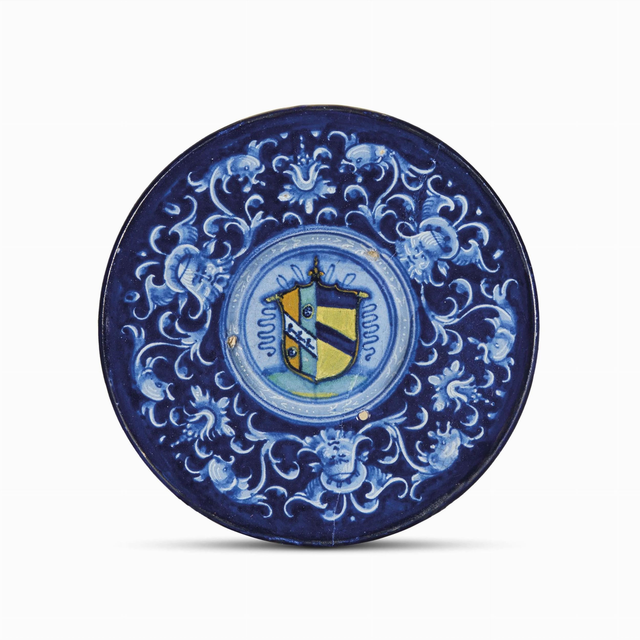 in maiolica dipinta a policromia con blu di cobalto, bianco di stagno, verde ramina, giallo citrino e giallo arancio su fondo a smalto berettino; presenta cavetto fondo, piede ad anello non rilevato e un’ampia tesa a bordo arrotondato profilato di blu. Sulla tesa si estende una decorazione a grottesche con teste barbate canefore e delfini, mentre la balza è decorata con un sottile motivo fitoforme in bianco di stagno su fondo berettino a incorniciare il cavetto, centrato da uno stemma nobiliare dipinto in policromia, non identificato. Al verso si sviluppa un motivo decorativo a bande concentriche disposte a maglie larghe su fondo berettino. Il piatto mostra la classica decorazione faentina “a grottesche”, tipologia distintiva della produzione della città romagnola in un periodo compreso tra il 1502 e il 1532 circa, attraverso una fortunata serie di opere spesso associate proprio per l’emblema ad alcune delle maggiori famiglie nobiliari del Rinascimento. Il decoro a raffaellesche realizzato in questa modalità trova riscontro in alcuni dei ritrovamenti relativi al “servizio Pio” di Faenza; diam. cm 17,8, diam. piede cm 5,5, alt. cm 7,2