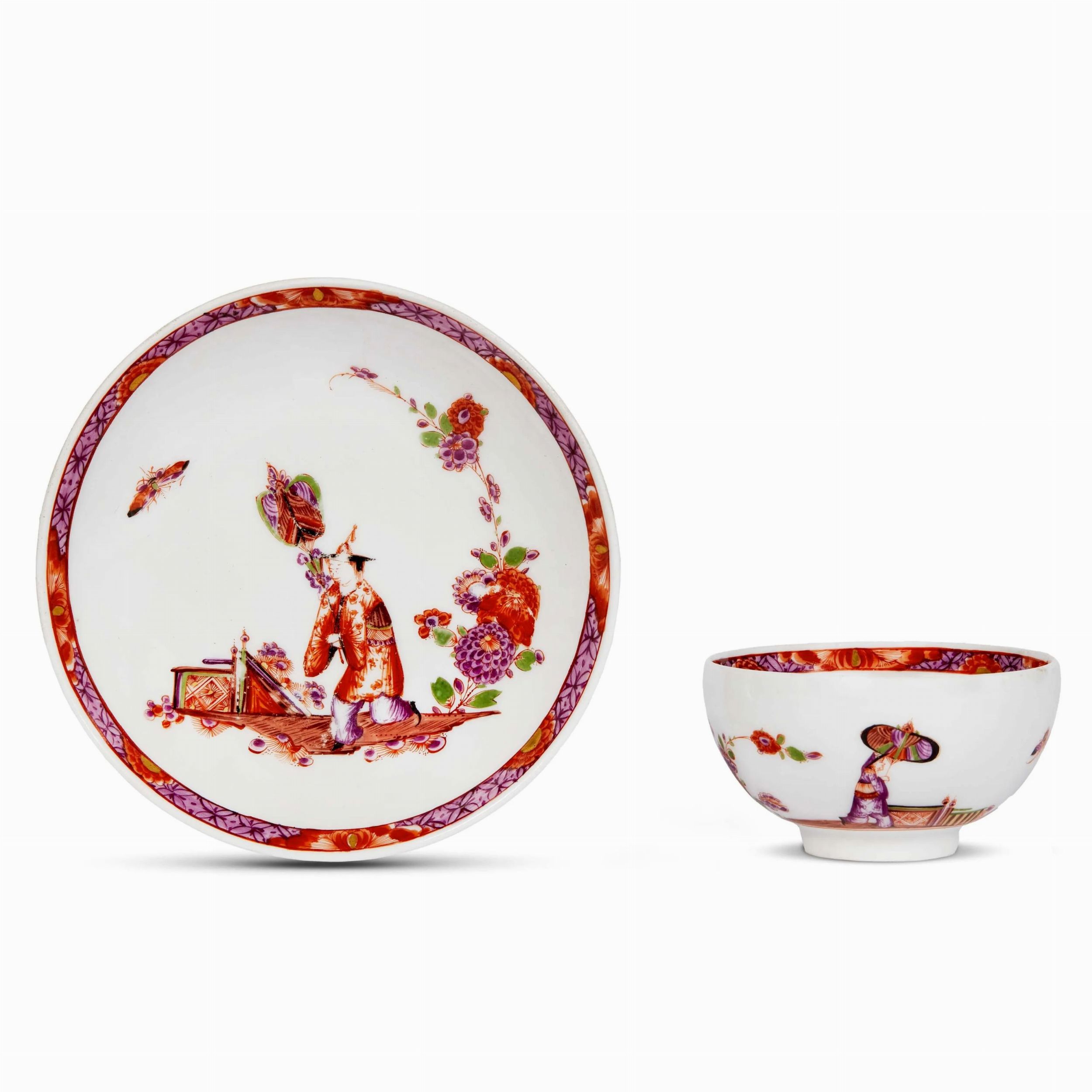 in porcellana dipinta in policromia, tazza a coppa emisferica priva di ansa e piattino circolare. L’esterno della tazza è decorato con personaggi con un ventaglio mentre l’interno presenta un piccolo fiore, il piattino è centrato da una scena con un personaggio orientale con copricapo che avanza reggendo un ventaglio in un giardino; bordi decorati in policromia con porpore a motivi orientali. Il decoro, opera di un Haussmaller, è probabilmente opera di Johann Ehrenfried Stadler, ed una tazzina analoga è stata esposta alla mostra torinese I fragili lussi nel 2001, cui facciamo riferimento per approfondimenti. Marca della manifattura in blu sul fondo; tazzina alt. cm 4, piattino diam. cm 11,7