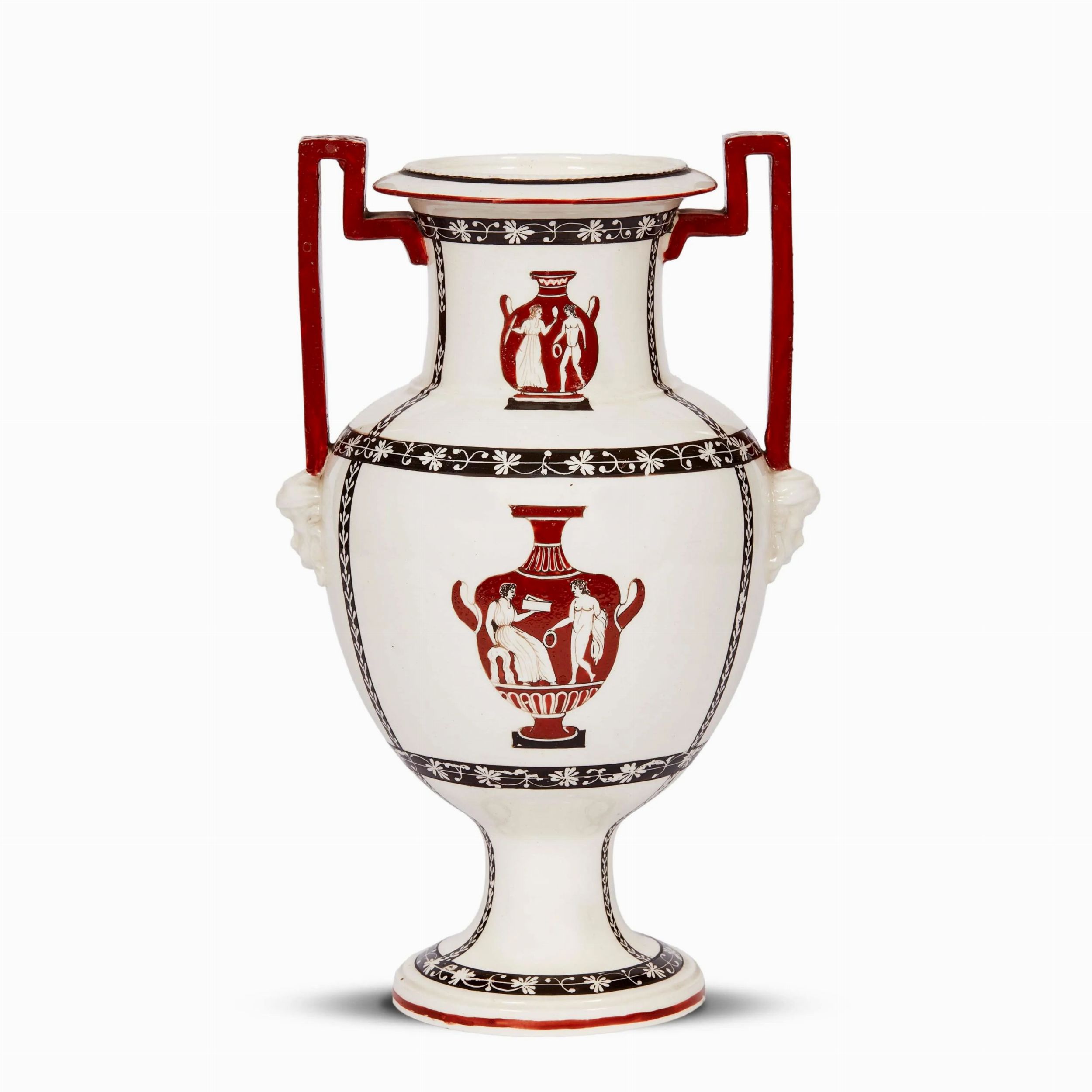 in terraglia dipinta in policromia, copro piriforme su alto piede svasato, collo cilindrico con bordo estroflesso, coppia di anse di linea spezzata poggianti su testine a rilievo. L’intera superficie del vaso è attraversata da fasce scure con motivo vegetale in nero a fioretti che si incrociano e vanno a formare delle riserve centrate da raffigurazioni di vasi archeologici delineati in rosso ferro; alt. cm 29,5, diam. bocca cm 11,7, diam. piede cm 10,7