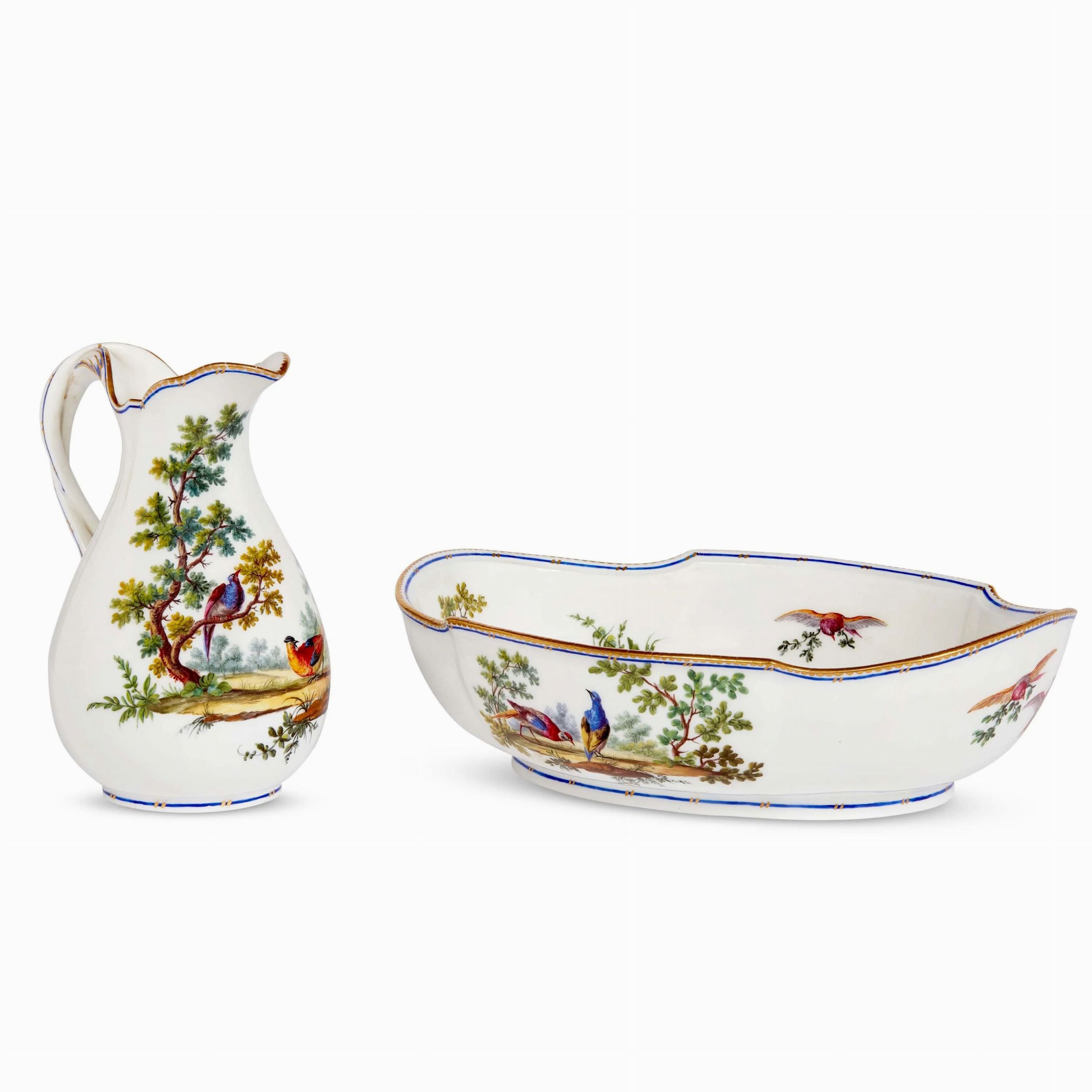 in porcellana tenera dipinta in policromia e oro. Il bacile alto e lobato è accompagnato da una brocca piriforme con ansa intrecciata, ed entrambi recano una decorazione a paesaggi con uccelli esotici, tipici della pittura di Etienne Evans, che lavora nella manifattura di Sévres dal 1752 fino al 1806. Gli esemplari di confronto noti in collezione museali, come ad esempio le opere oggi al Louvre di Parigi oppure la zuccheriera (inv 1976.155.77a, b) e la écuelle (50.211.147a, b) del Met di New York, danno preciso riscontro stilistico con questo raro esemplare. Sul fondo di entrambe i pezzi marca di manifattura in blu che racchiude le lettere F e I unite (riferite al periodo 1759-1762) e un pugnale, marchio del decoratore Evans; versatoio alt. cm 17,2, bacile cm 7,8x27x21,5