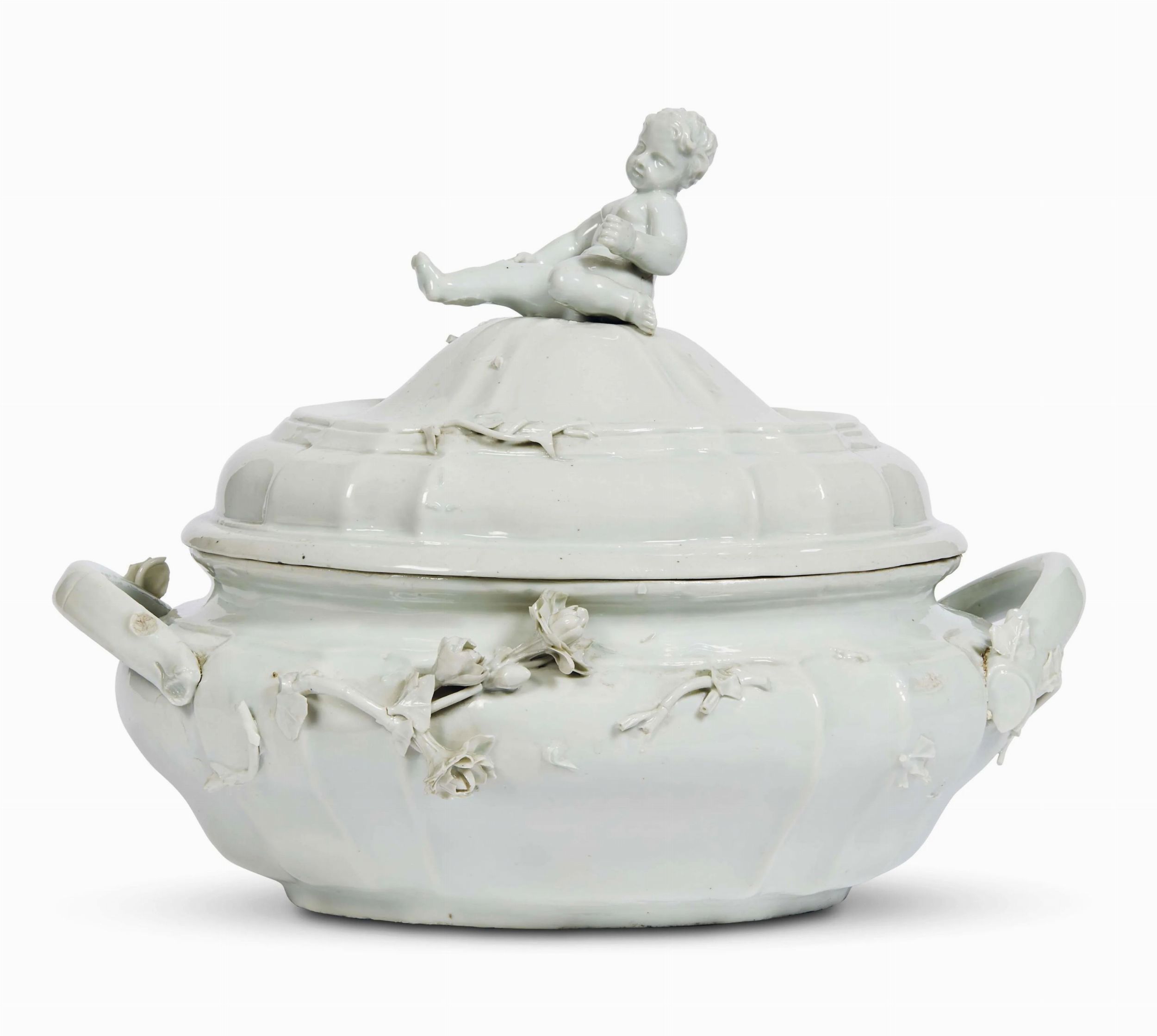 in porcellana, corpo ovale sagomato e costolato con coperchio coerente, materia spessa, con vetrina azzurrata con qualche bollitura e difetti di cottura, ma che esalta la forma del pezzo. La forma, tratta dai modelli dell’argenteria coeva, poggia su base piana; le prese applicate, a sezione circolare, imitano la forma di un piccolo ramo attorno al quale si innestava la decorazione, modellata a forma di sottili rami di rose e fioretti a tutto tondo. La medesima ornamentazione era ripetuta sul coperchio, sormontato da una figurina di fanciullo seduto. Il modello fu impiegato con varianti in manifattura, e trova confronto in una zuppiera con tralci fioriti della raccolta di Arti Applicate del Castello Sforzesco di Milano databile al 1750/55 e una nel Museo della Manifattura; largh. massima cm 32,5, prof. massima cm 26, alt. cm 25,5; completa di base in legno modanato di forma sagomata, cm 5,5x26,5x21