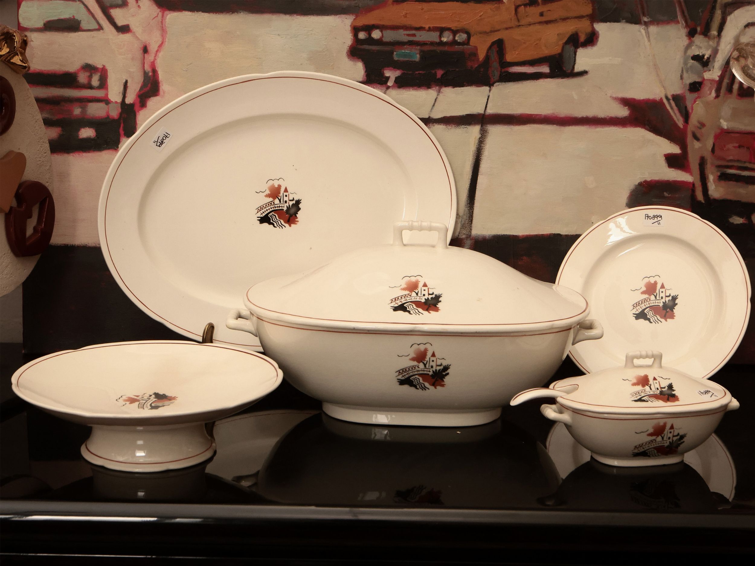 zuppiera h cm 20x36x22, vassoio cm 29x37,5 (11) Anni Trenta decorato con paesaggio nei toni del rosso e del nero, composto da 6 piattini da antipasto, una zuppiera, un vassoio ovale, 2 alzatine ed una salsiera corredata da mestolo