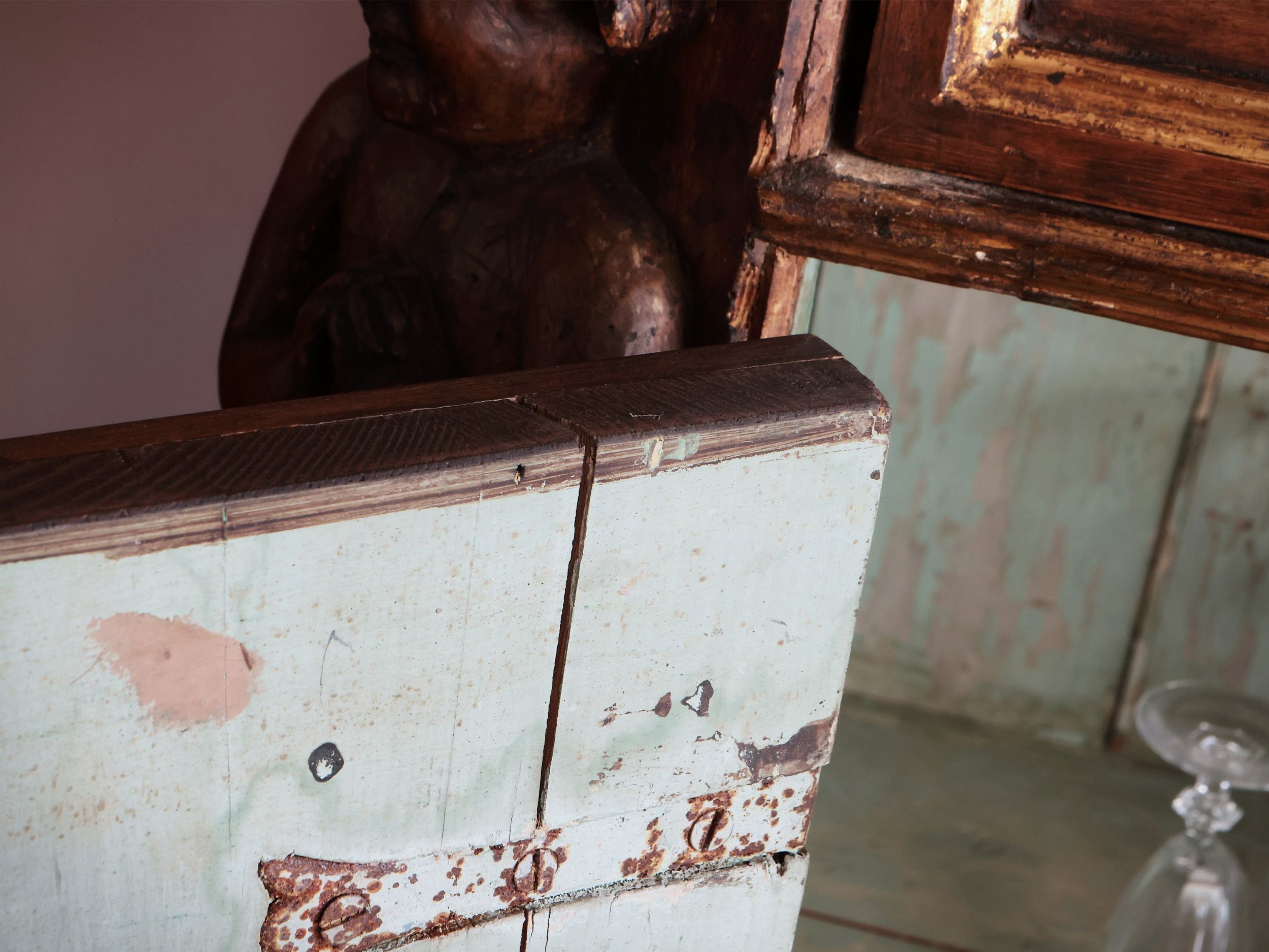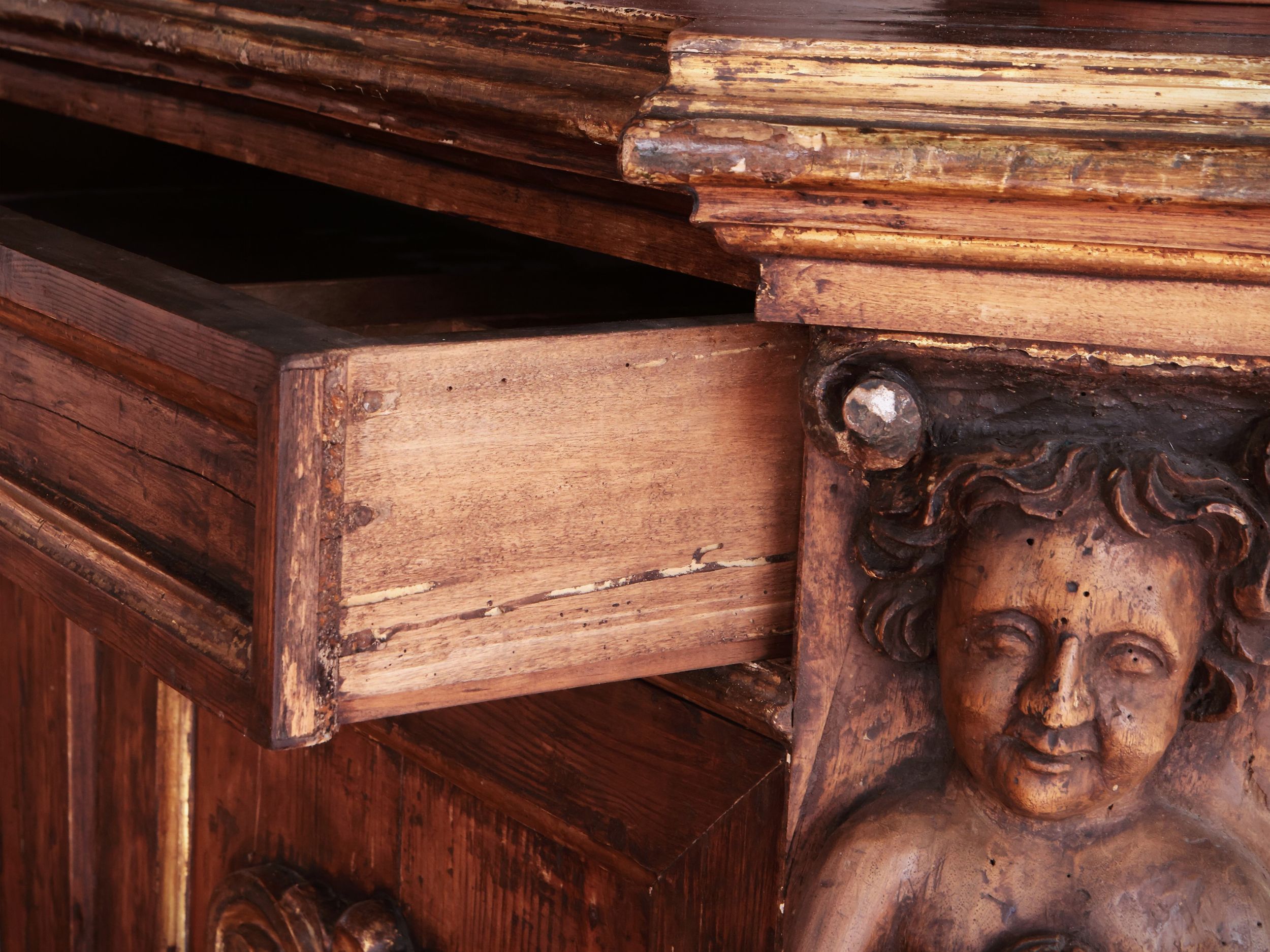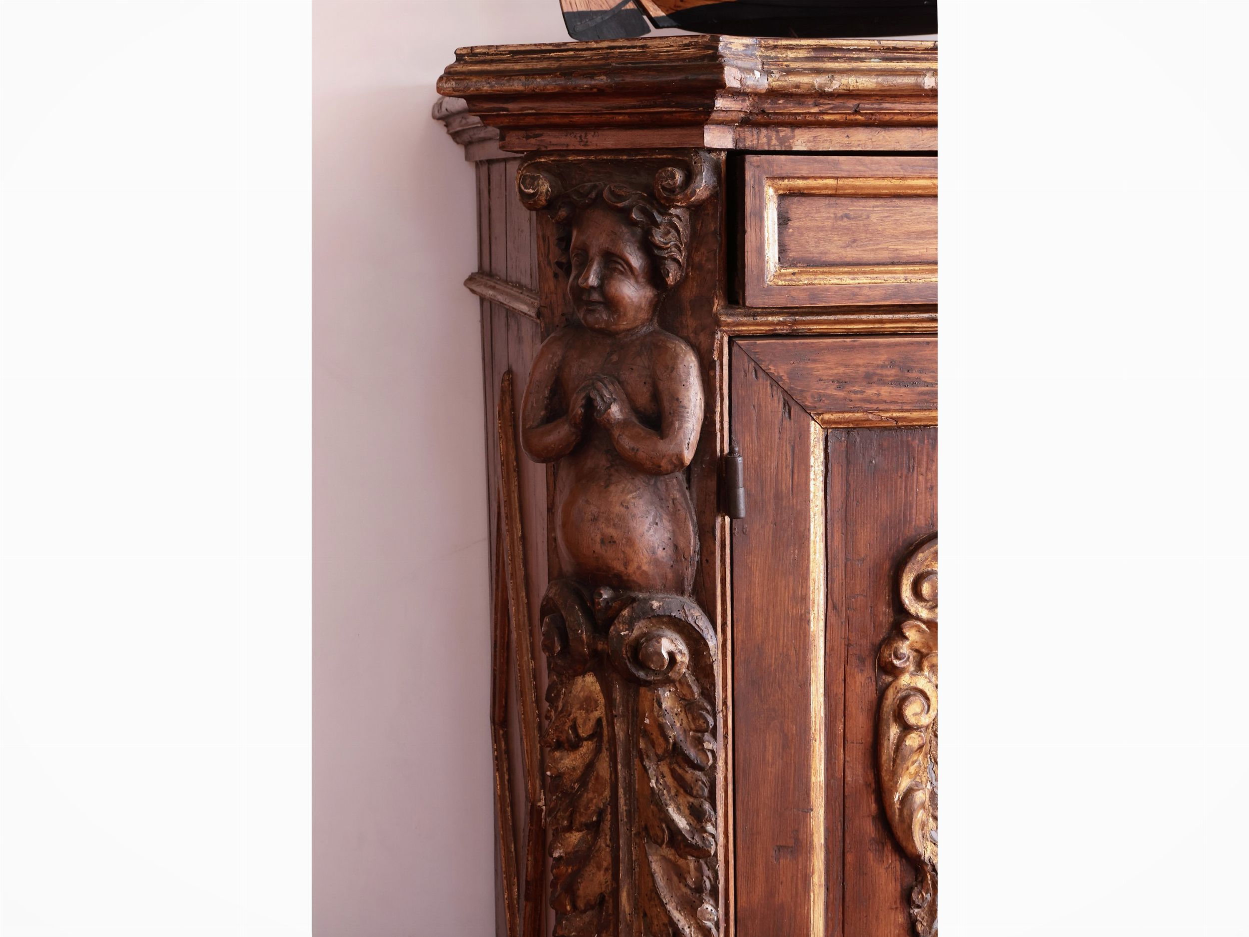h cm 108x130x60 Spagna, XVIII secolo piano sagomato con angoli scantonati aggettanti con sottostanti lesene intagliate a bambocci e ghirlande vegetali, un cassetto nella fascia, due sportelli sul fronte centrati da cornici riccamente intagliate e lumeggiate in oro, base a cornice, alcune integrazioni e restauri