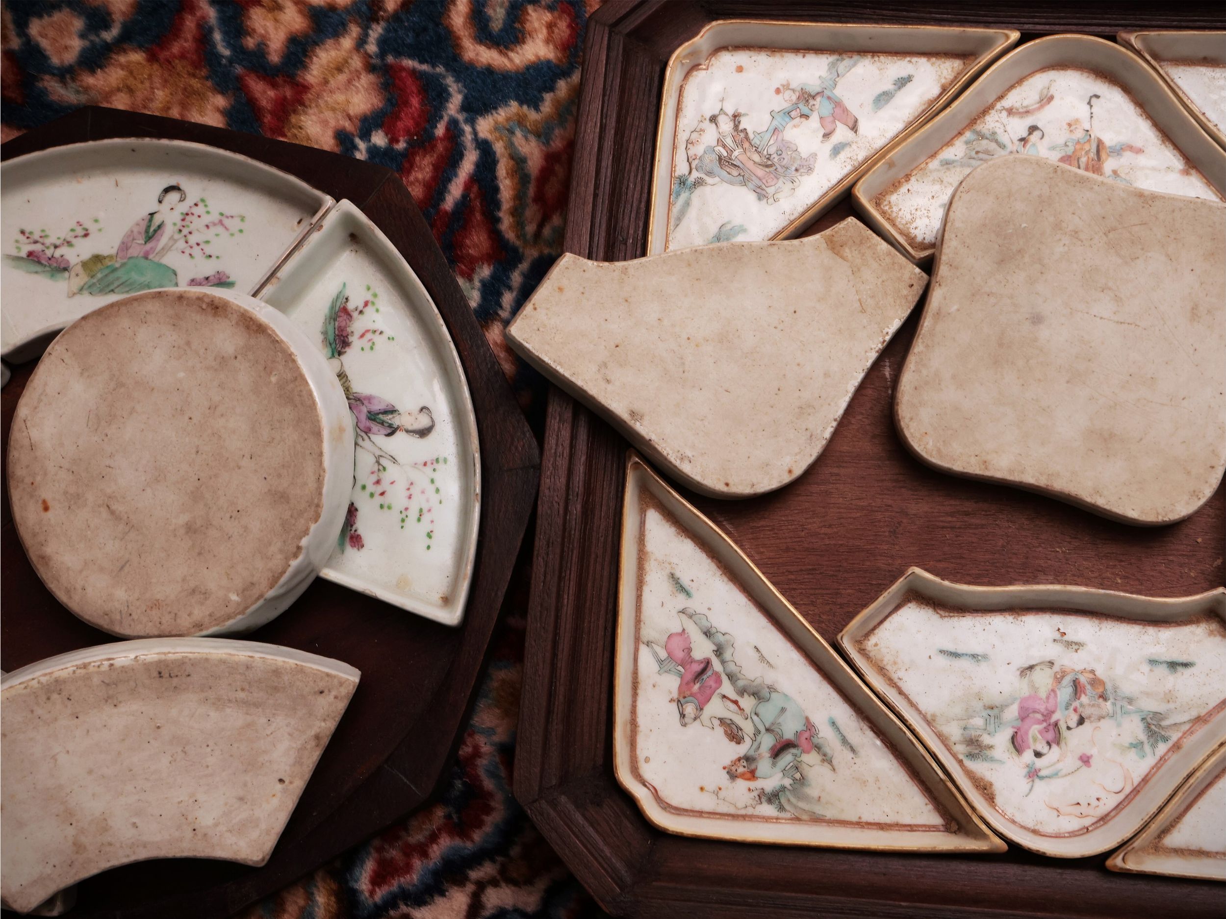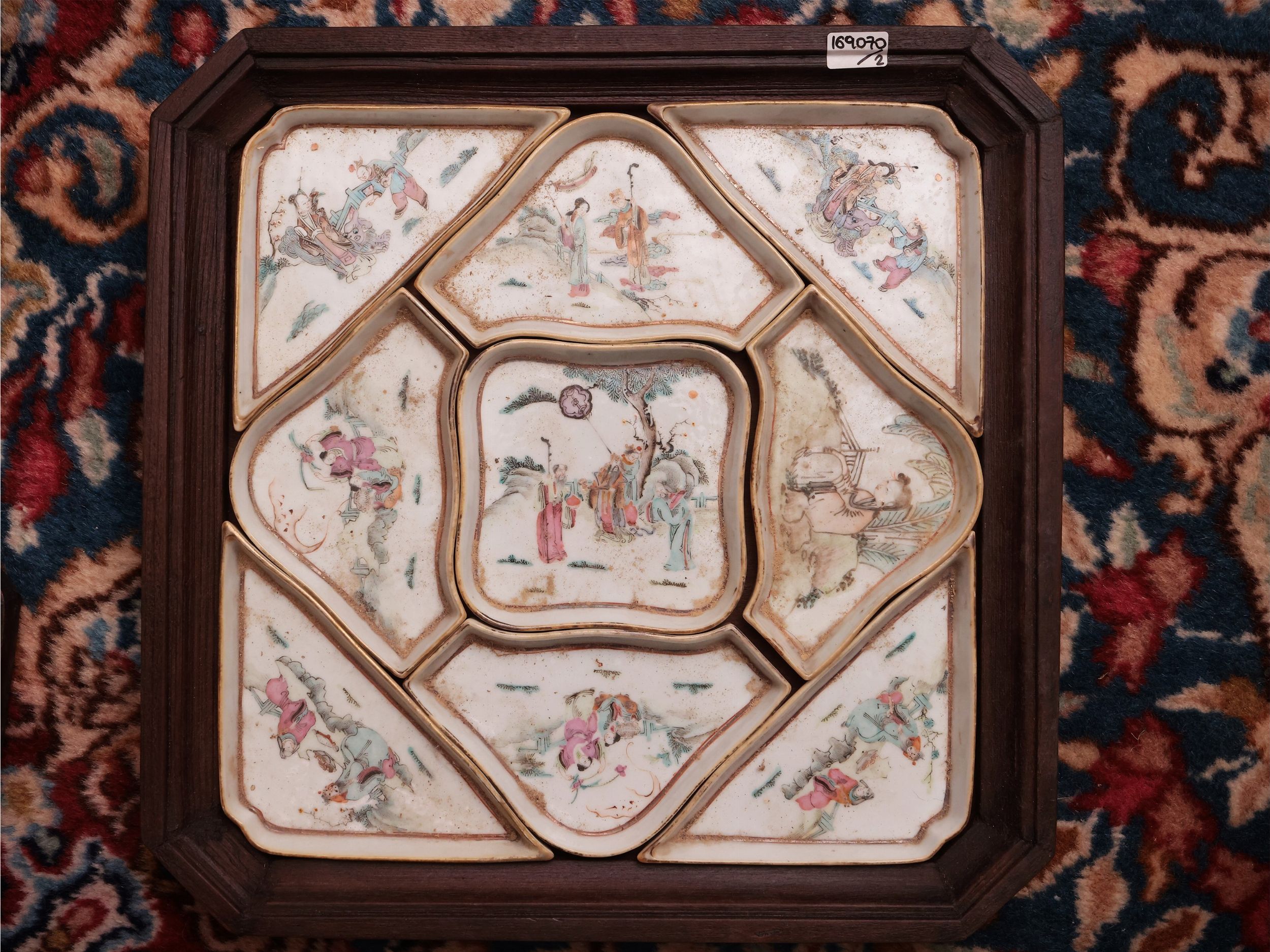 Cina, XIX/XX secolo dipinti in policromia con scene di genere, contenute entro vassoio in legno