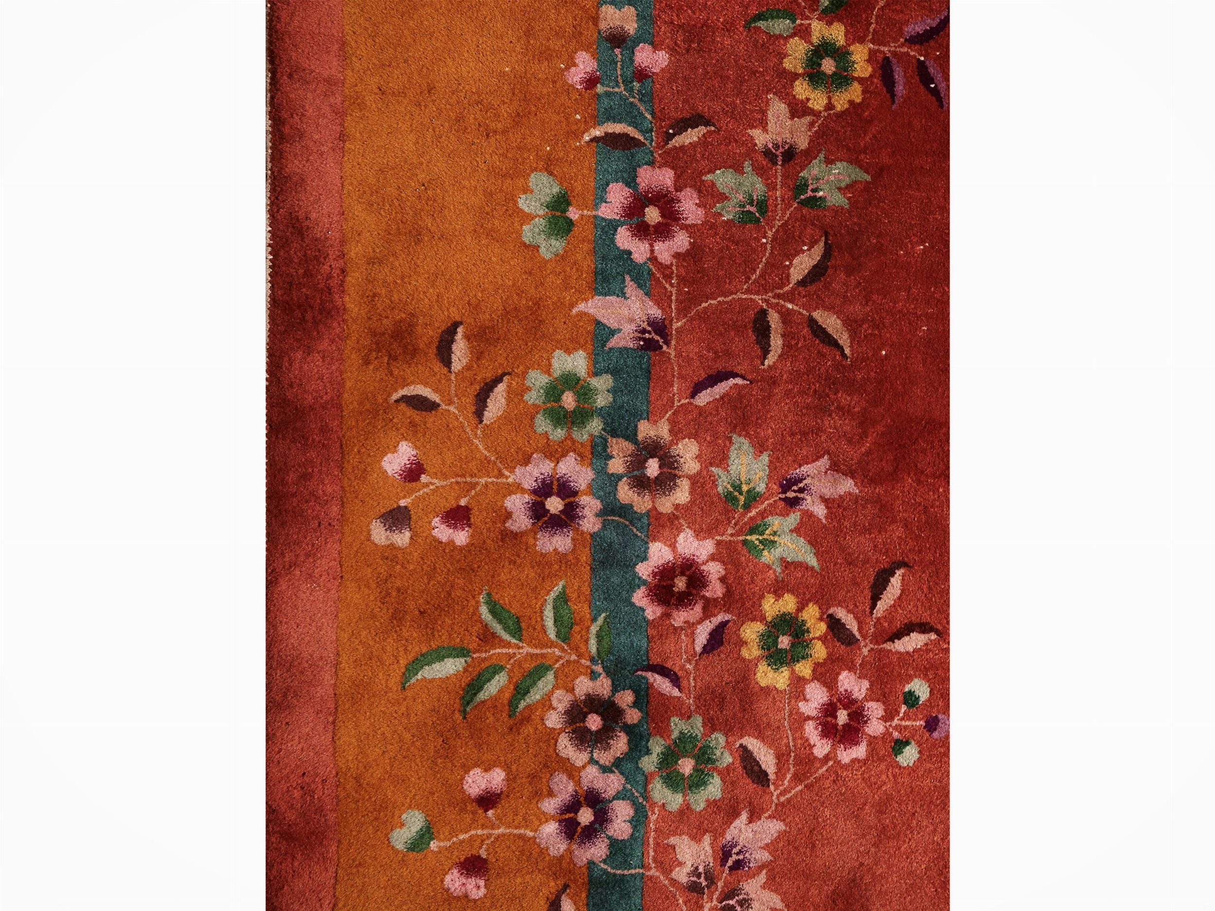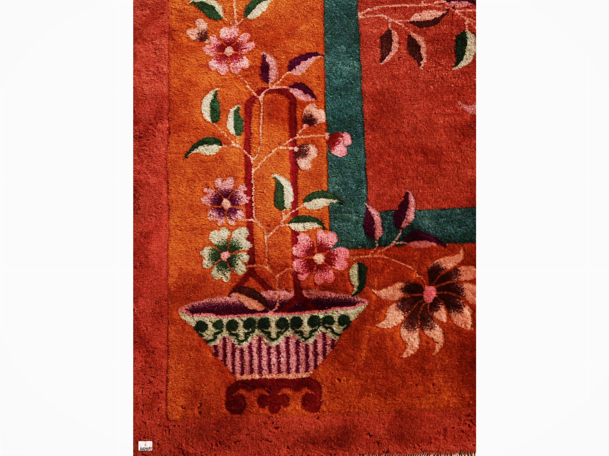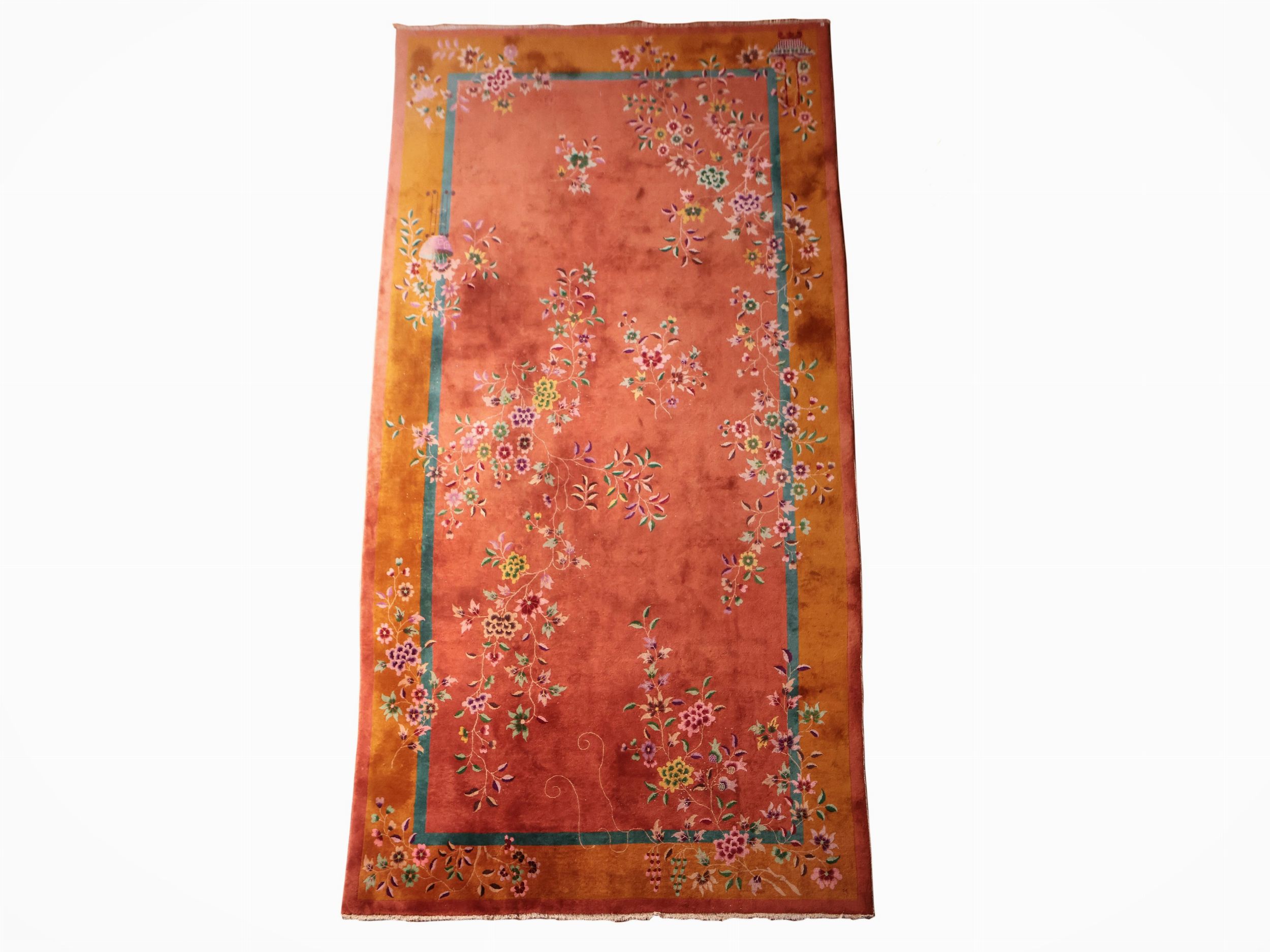 Cina, XX secolo campo magenta con alta bordura color zafferano e dettaglio azzurro, motivi floreali sinuosi di grandi peonie in tono, alcuni difetti