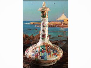 h cm 36 Cina, metà del XIX secolo dipinta in policromia con scene di genere entro riserve ovali su fondo decorato [..]