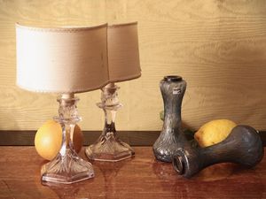 gr 4340, h cm 50 (2) quattro sinuosi bracci portacandele modellati con motivo vegetale, stelo a colonna sbalzato [..]