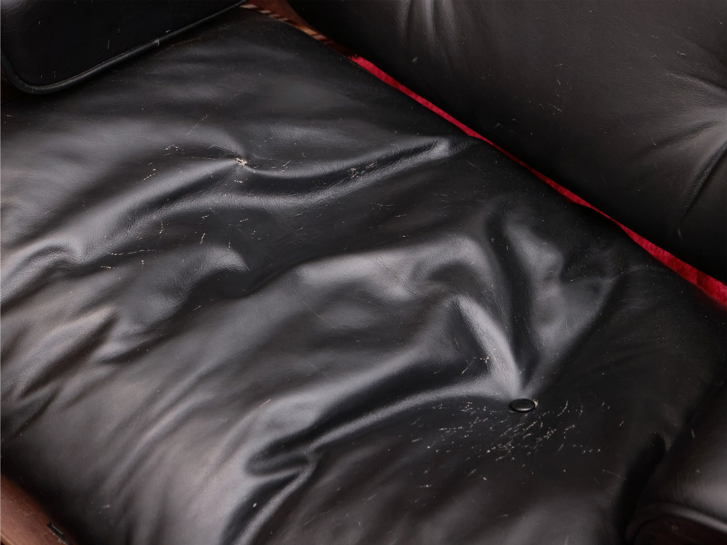 struttura in legno compensato curvato sagomato e impiallacciato, sostegni in alluminio e seduta con rivestimenti in pelle nera