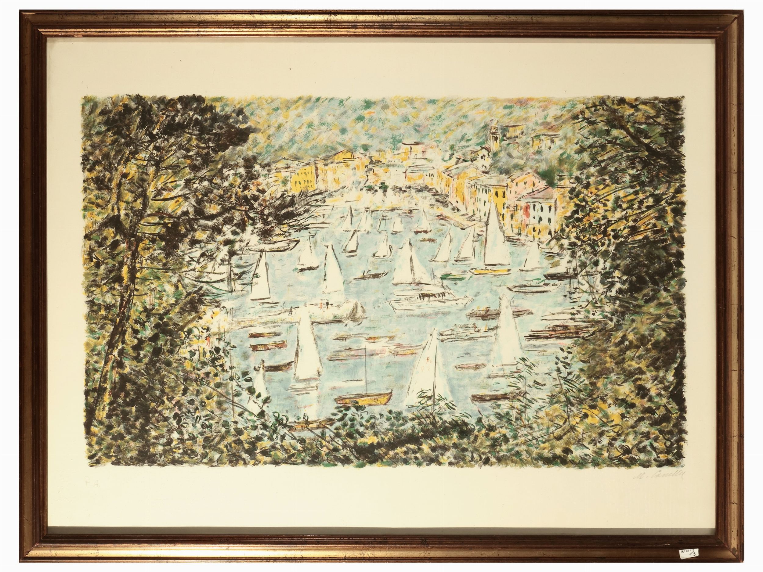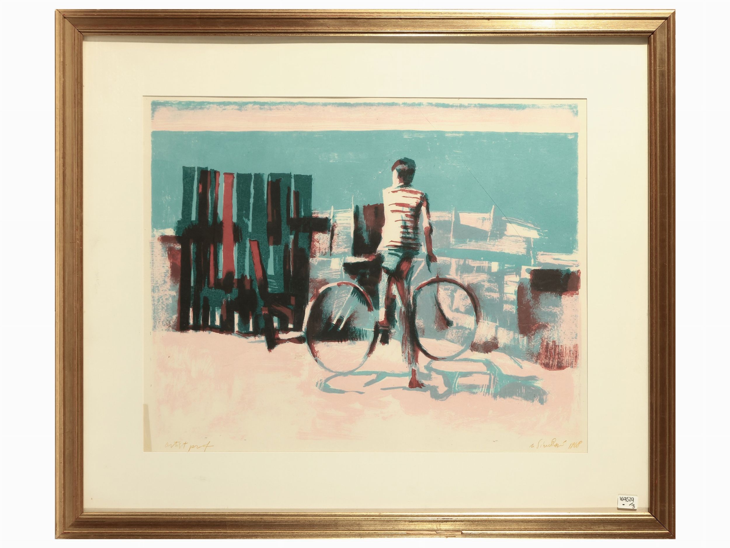 Xavier Bueno (1915-1979), Nudo femmile, litografia, es. 90/100, firmato, in cornice Michele Cascella, Portofino, litografia, p.a., firmato, in cornice Nicola Simbari (1927-2012), Bikers 1968, litografia, p.a., firmato e datato, in cornice