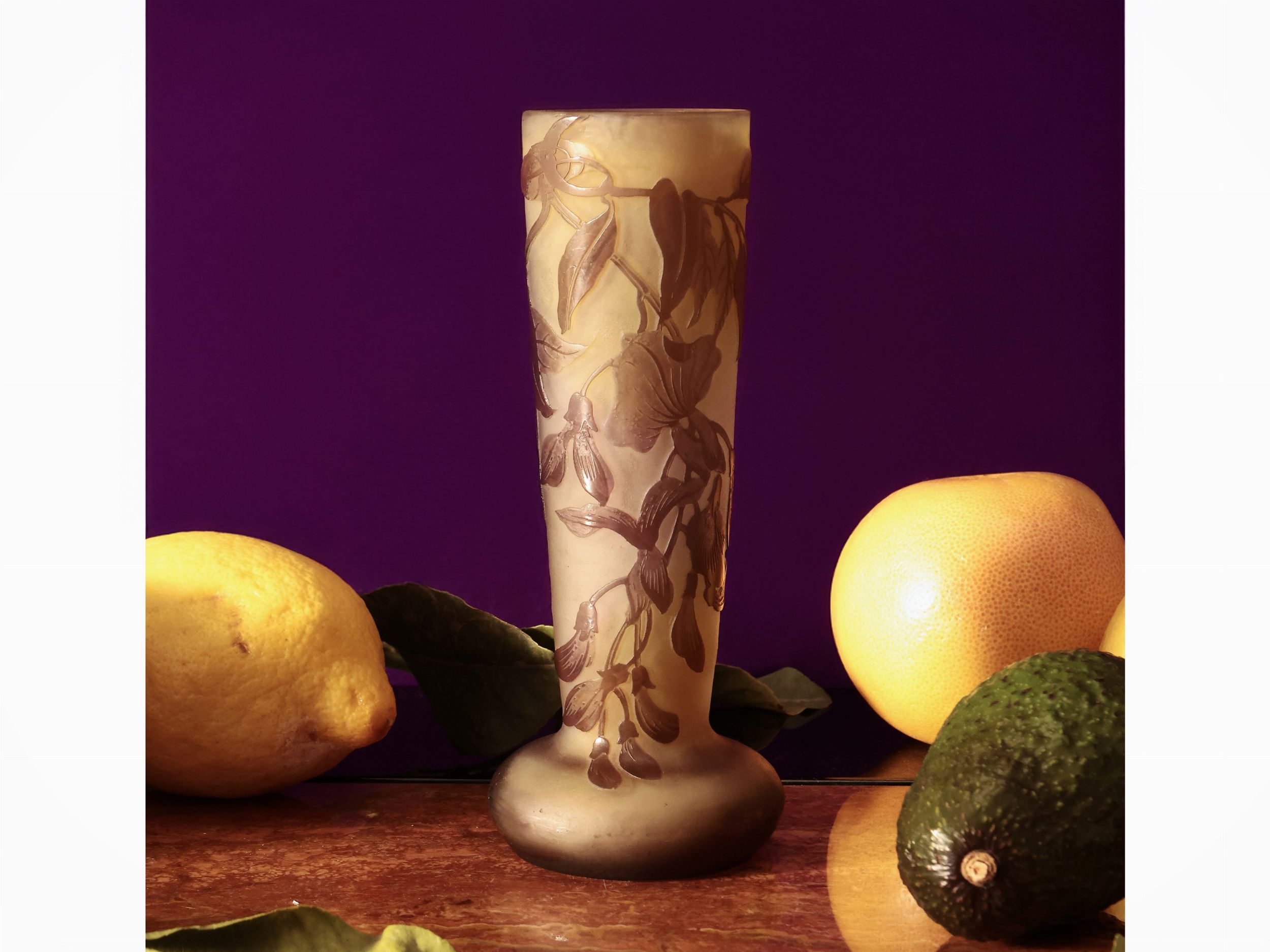 base a cipolla, in vetro doppio a cammeo con decoro di fiori e foglie (usura di calcare all'interno). Firma sul corpo Gallé con stella.