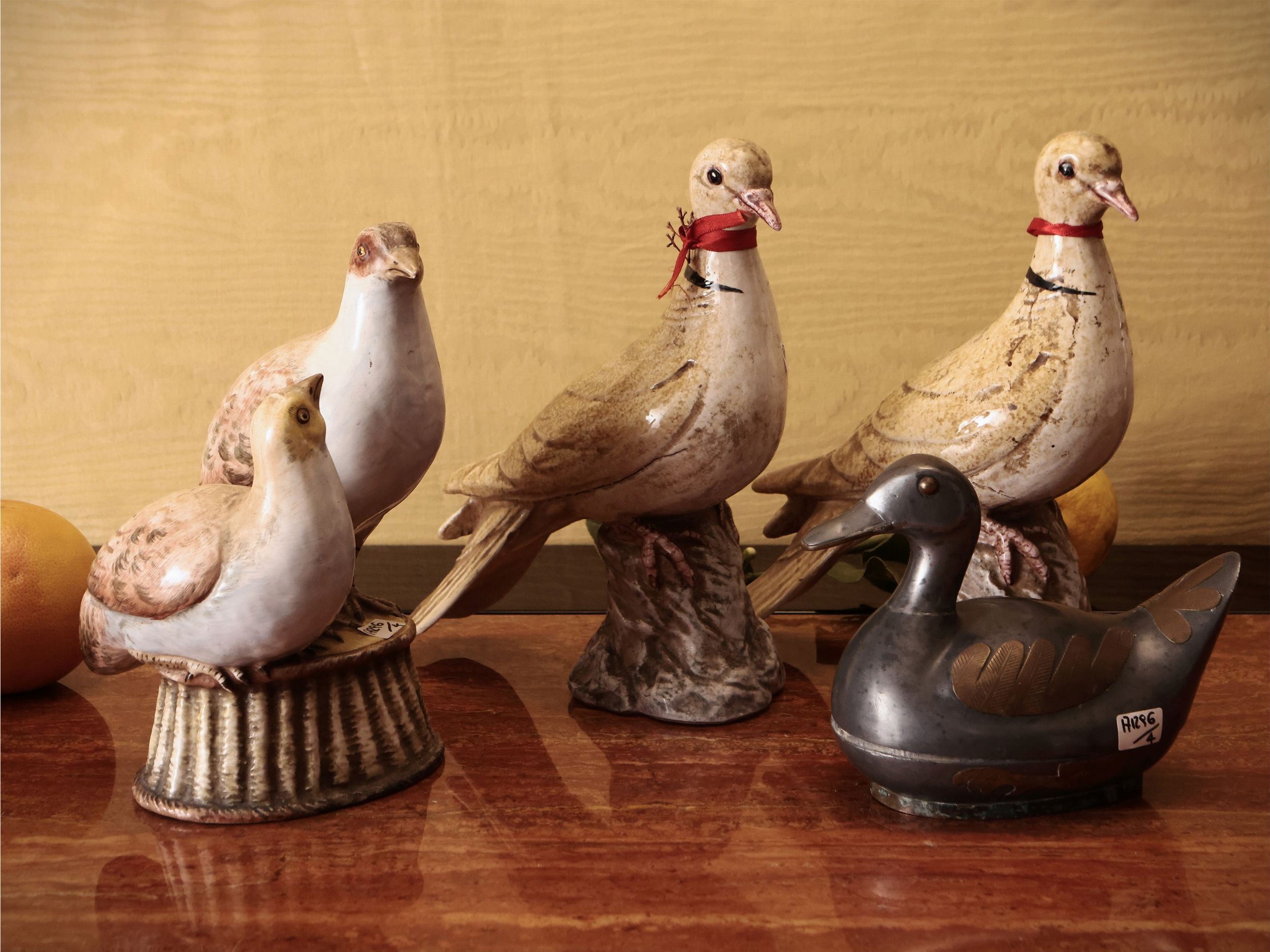 Quattro volatili in terracotta smaltata e metallo