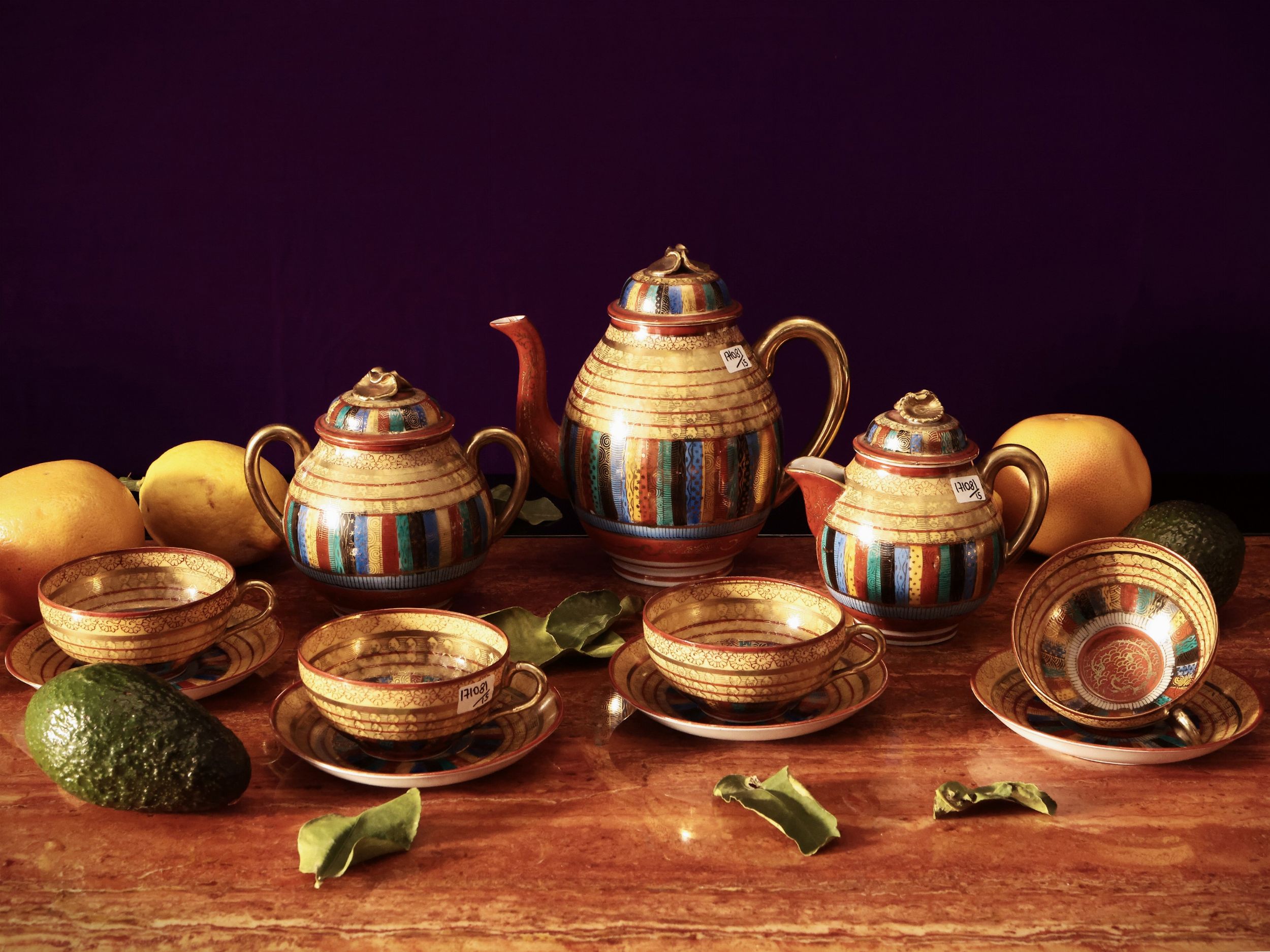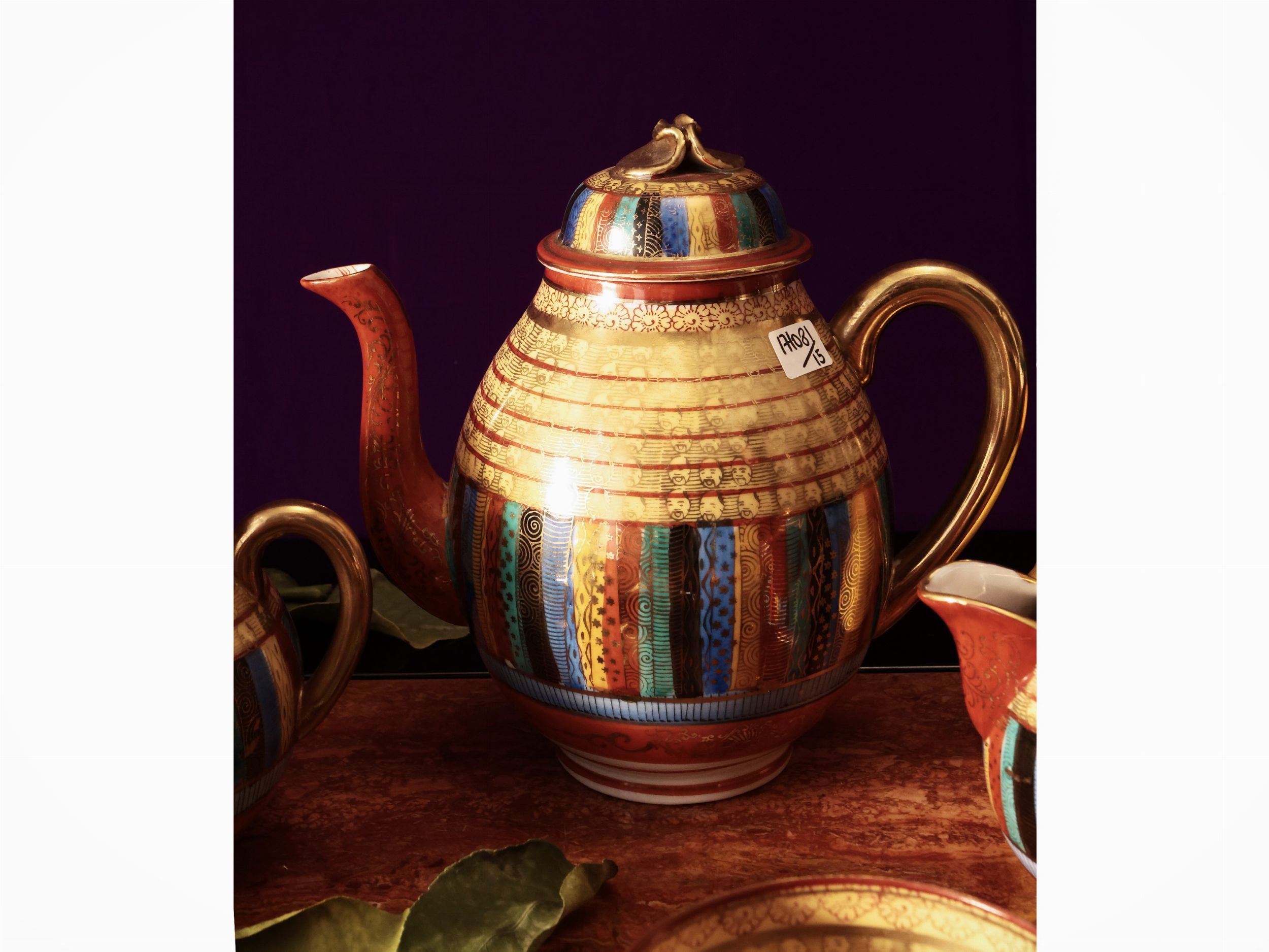 Giappone, XX secolo decorato in policromia con volti e motivo vegetale e floreale, lumeggiato in oro, composto da teiera, lattiera, zuccheriera e serie di dodici tazze corredate da piattino