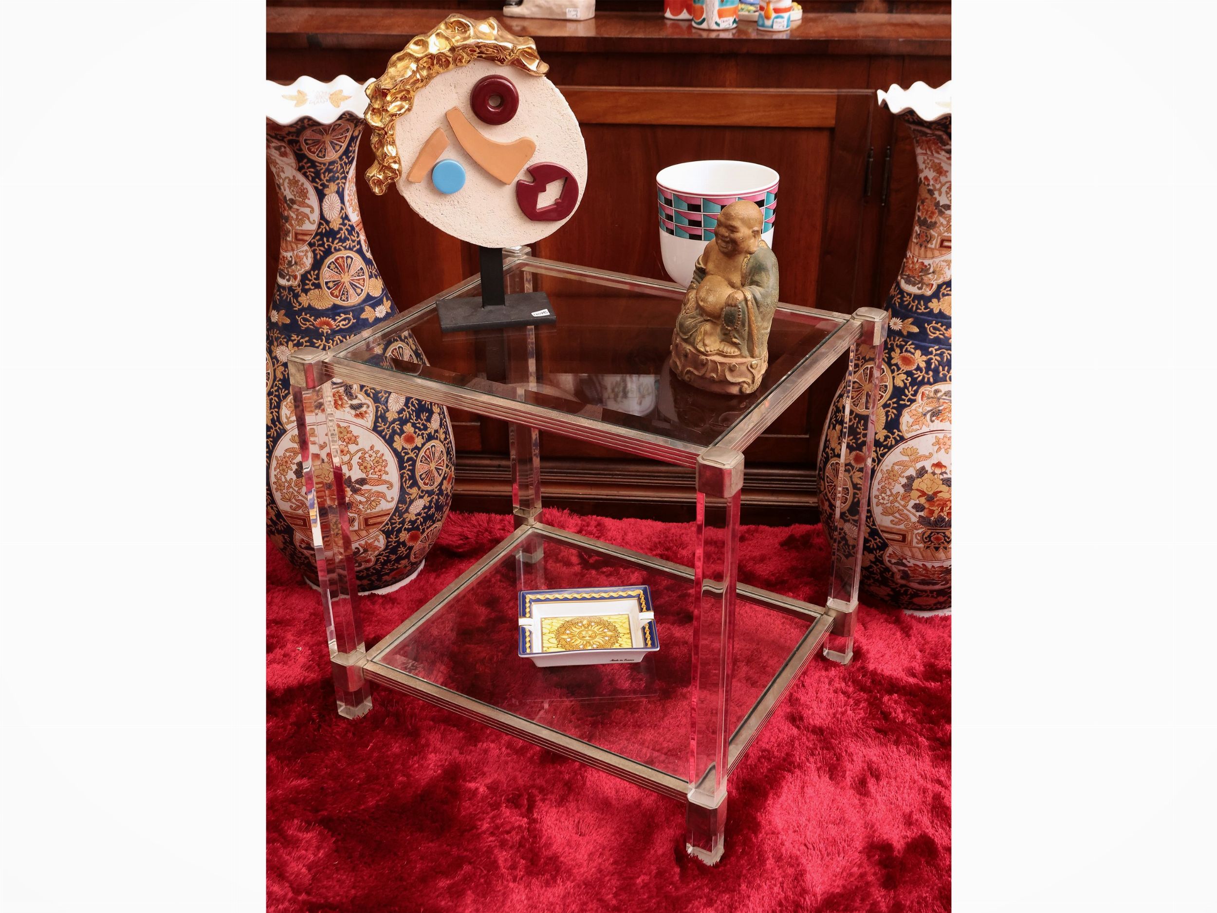 Anni Settanta due ripiani in cristallo, struttura in metallo cromato e sostegni in plexiglass