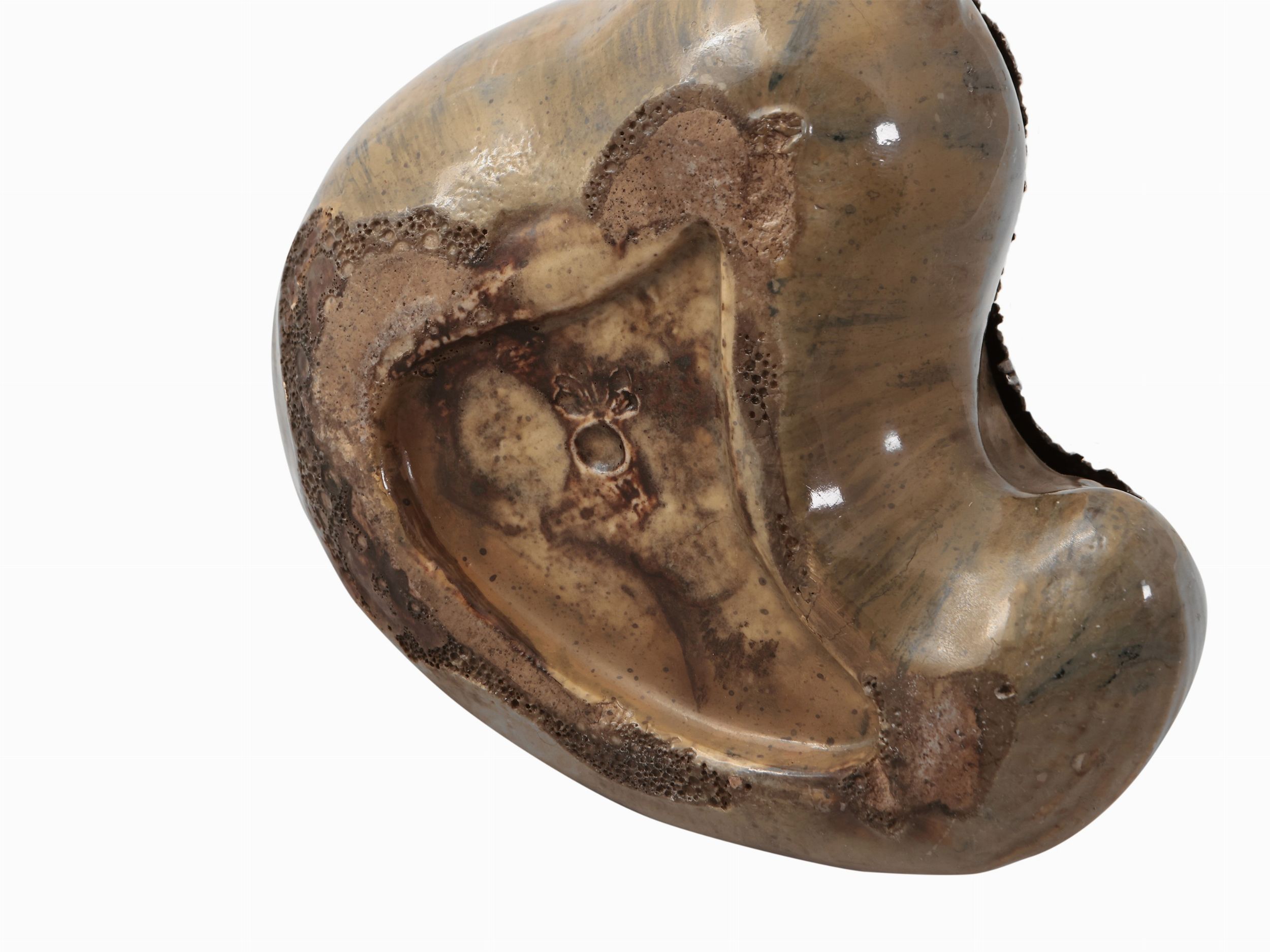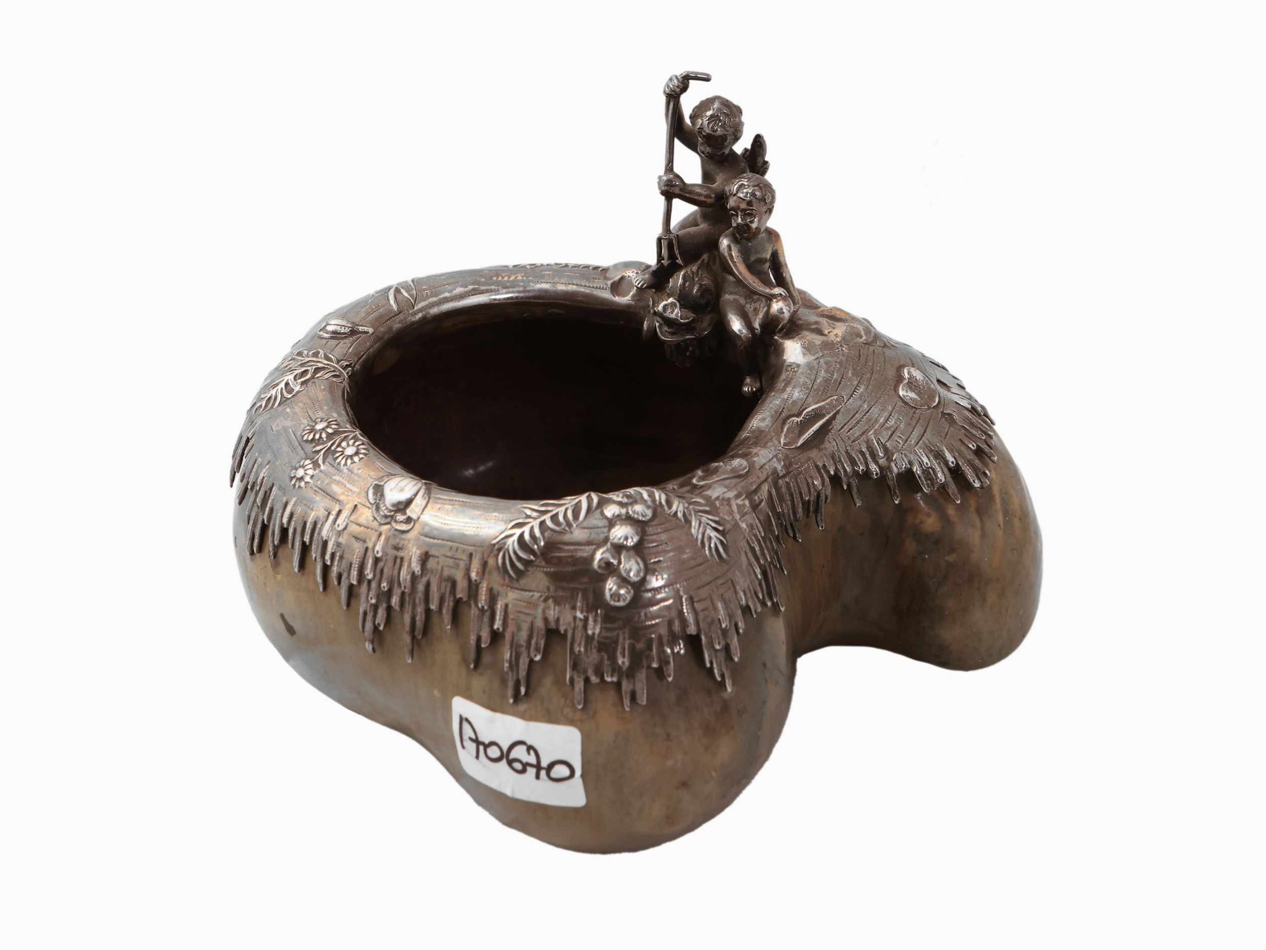Francia, inizio del XX secolo realizzata a foggia di conchiglia, bordo rilegato in argento ornato da piccolo gruppo a tutto tondo con due putti che cavalcano un delfino barocco