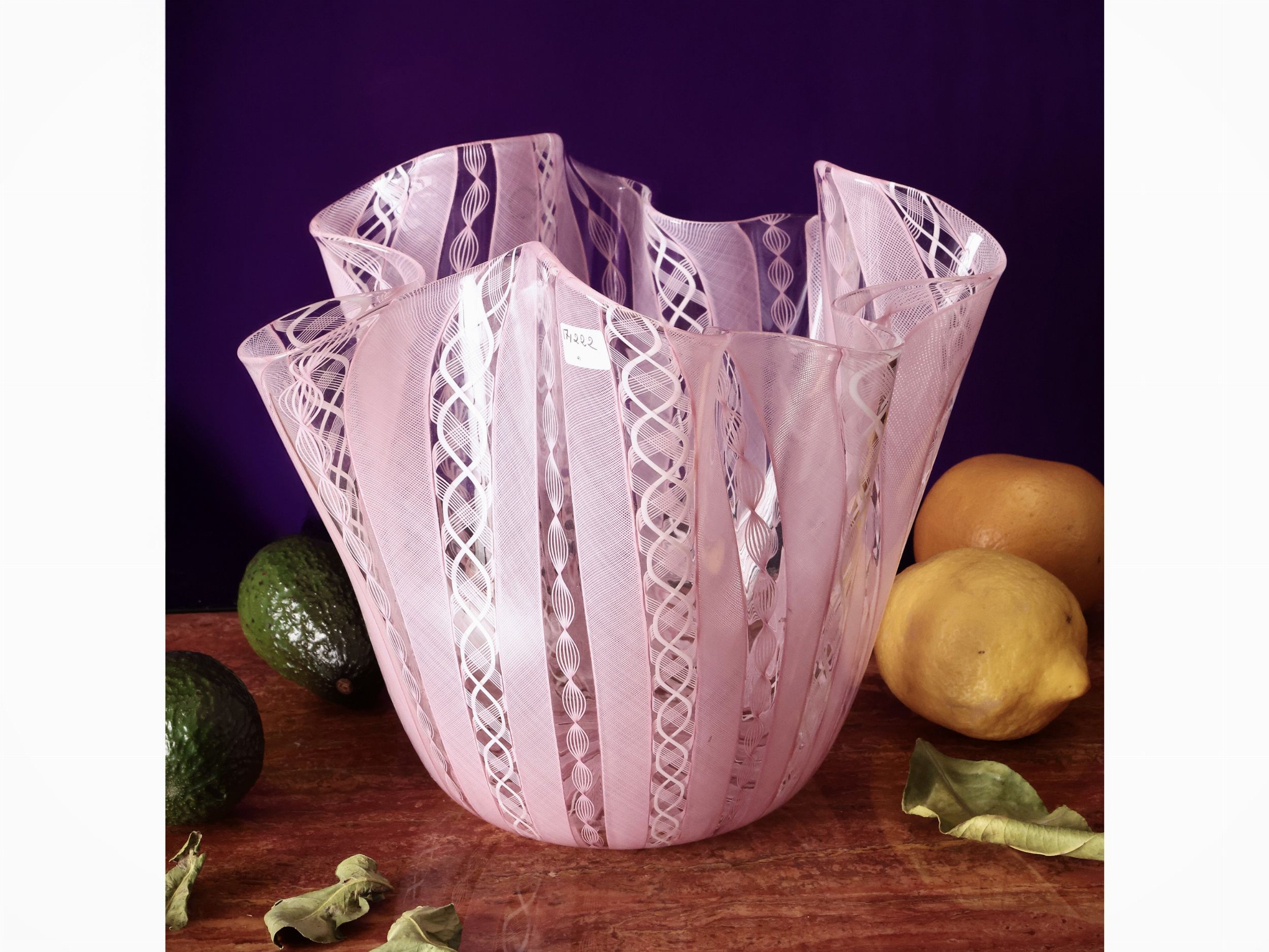 Murano, seconda metà del XX sec. in vetro soffiato rosa con canne a reticello e zanfirico. Firma sotto la base.