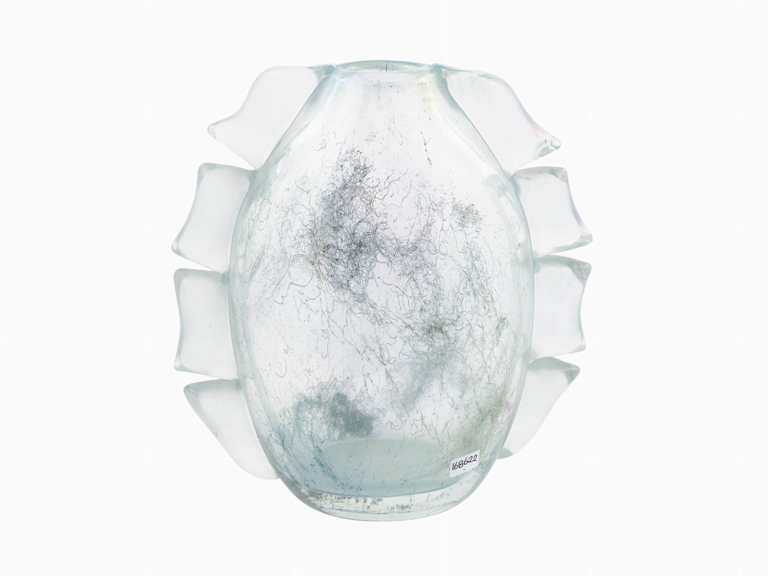 Murano, 1950 ca. con inclusione di filamenti all'interno e creste laterali trasparenti applicate a caldo.
