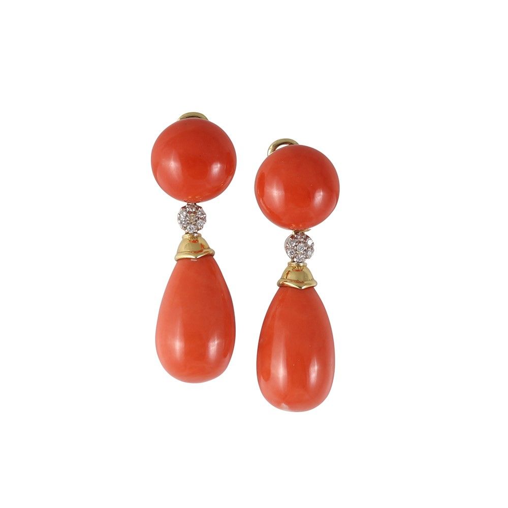 pendenti a clip realizzati in oro giallo con coralli e brillanti, gr. 29,5. Lunghezza 5 cm ca.