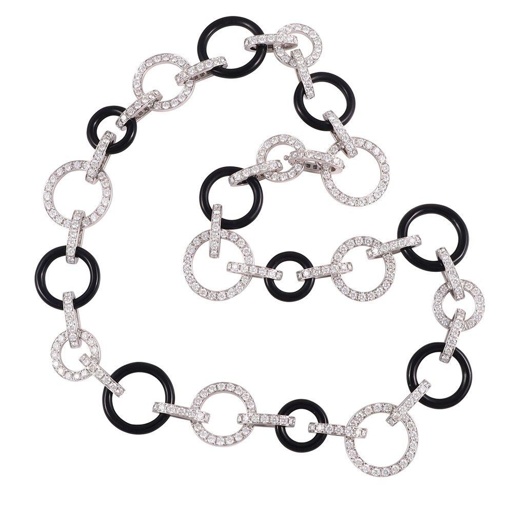 formata da cerchi in oro bianco ornati anteriormente da brillanti, alternati a cerchi in onice. Raccordati da maglie ovali interamente impreziosite da brillanti, gr. 59. Brillanti del peso complessivo di 20 ct ca. Lunghezza 49 cm