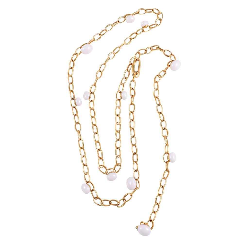 in oro rosa a maglie ovali, ceramica bianca e peridoto, gr. 61,3. Lunghezza 88 cm ca. (regolabile) Firmata: Pomellato Numerata: C160035200
