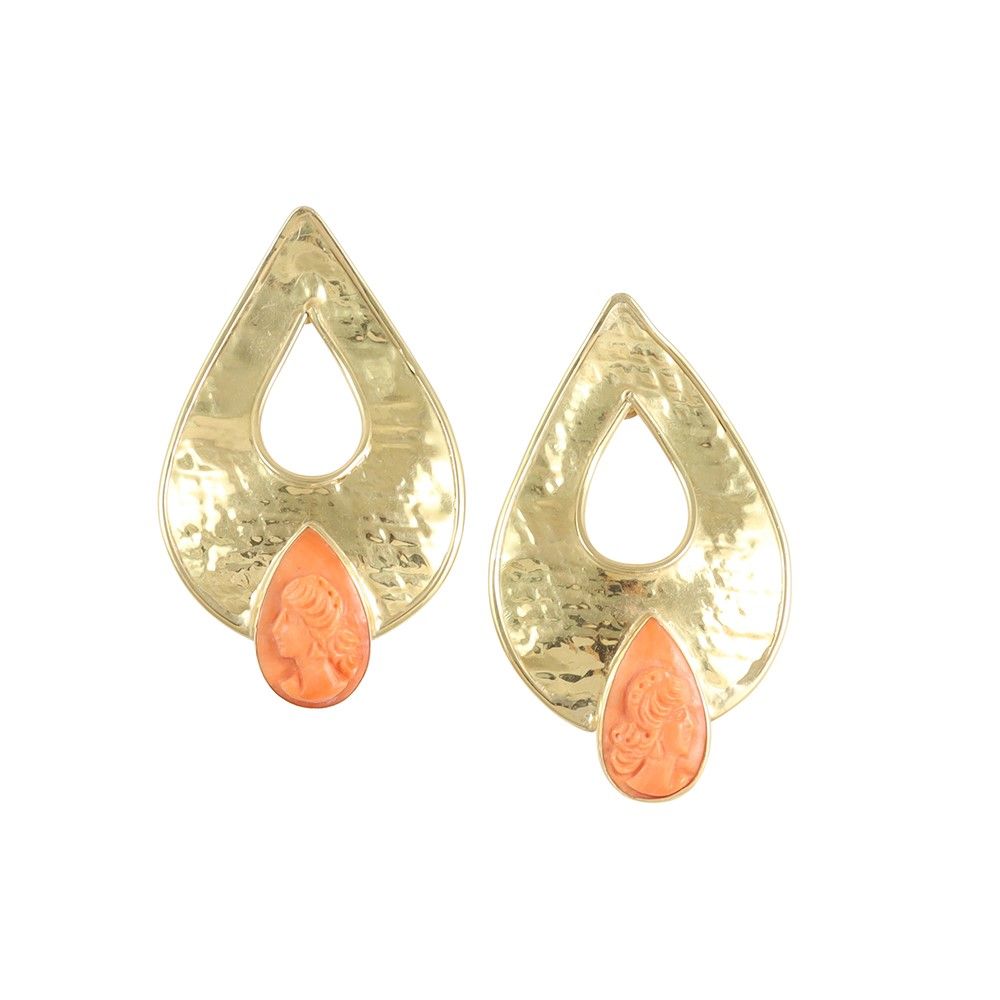 in lastra d'oro giallo a forma di goccia, ciascuno con cammeo di corallo raffigurante un profilo muliebre, gr. 11,1. Dimensioni 5 x 3 cm ca. Firmati: Sal Mar