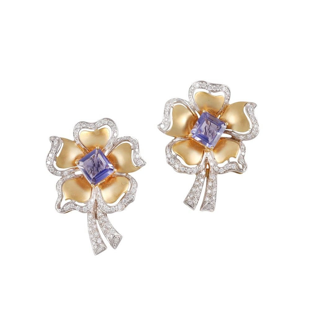 a fiore con clip e perno montati in oro giallo satinato e bianco ornati da brillanti del peso complessivo di 1,40 ct ca., ciascuno con al centro una iolite rettangolare, gr. 33,8. Dimensioni 4 x 3 cm ca.