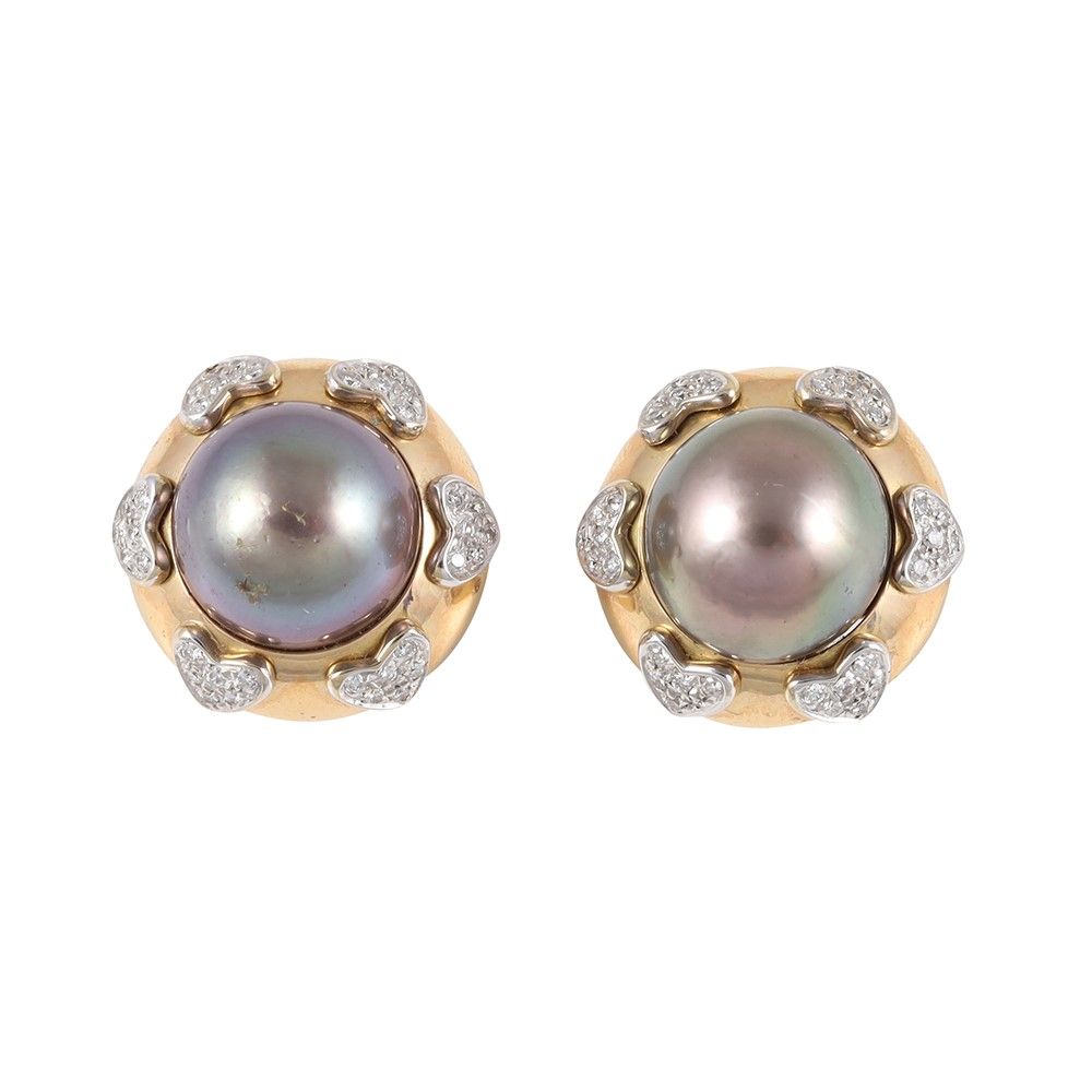 a clip con perno in oro giallo ciascuno con perla coltivata Tahiti del diametro di 13,5 mm contornata da cuori in oro bianco ornati da brillanti del peso complessivo di 0,65 ct ca., gr. 30,3. Diametro 2 cm ca.