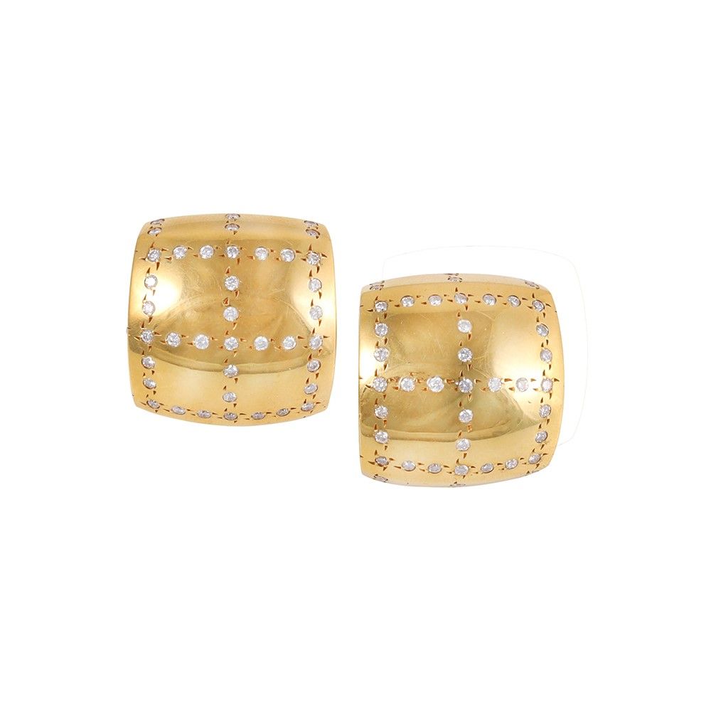 a clip con perno pieghevole montati in oro giallo a forma geometrica bombata ornati da brillanti del peso complessivo di 1,50 ct ca., gr. 36,8. Dimensioni 2,4 x 2,3 cm ca.