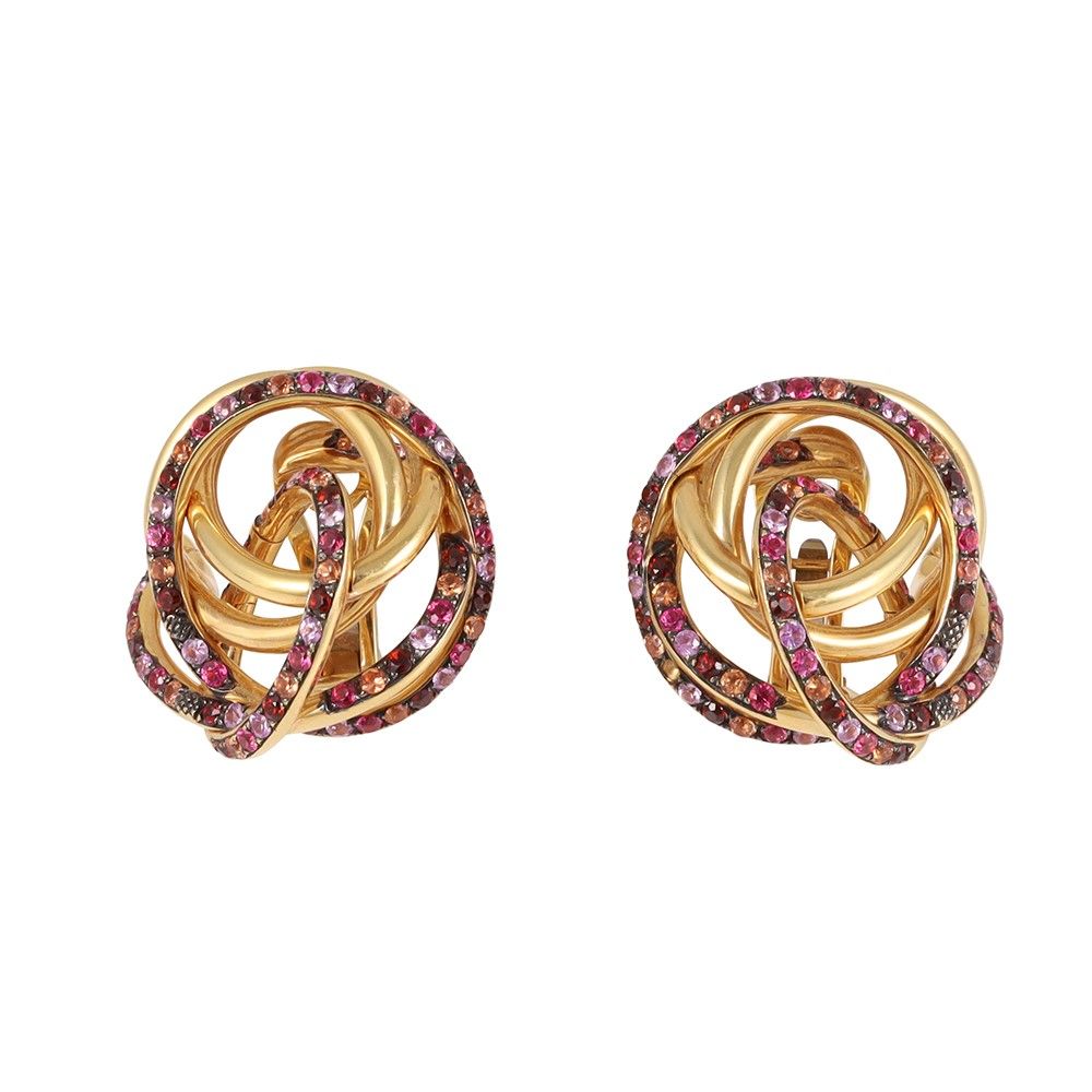 a clip con perno ripiegabile, realizzati in oro giallo a motivo intrecciato ornati da gemme tra cui corindoni e granati, gr. 40,2. Diametro 2,8 cm ca. Firmati: de Grisogono Numerati: 05 B9539