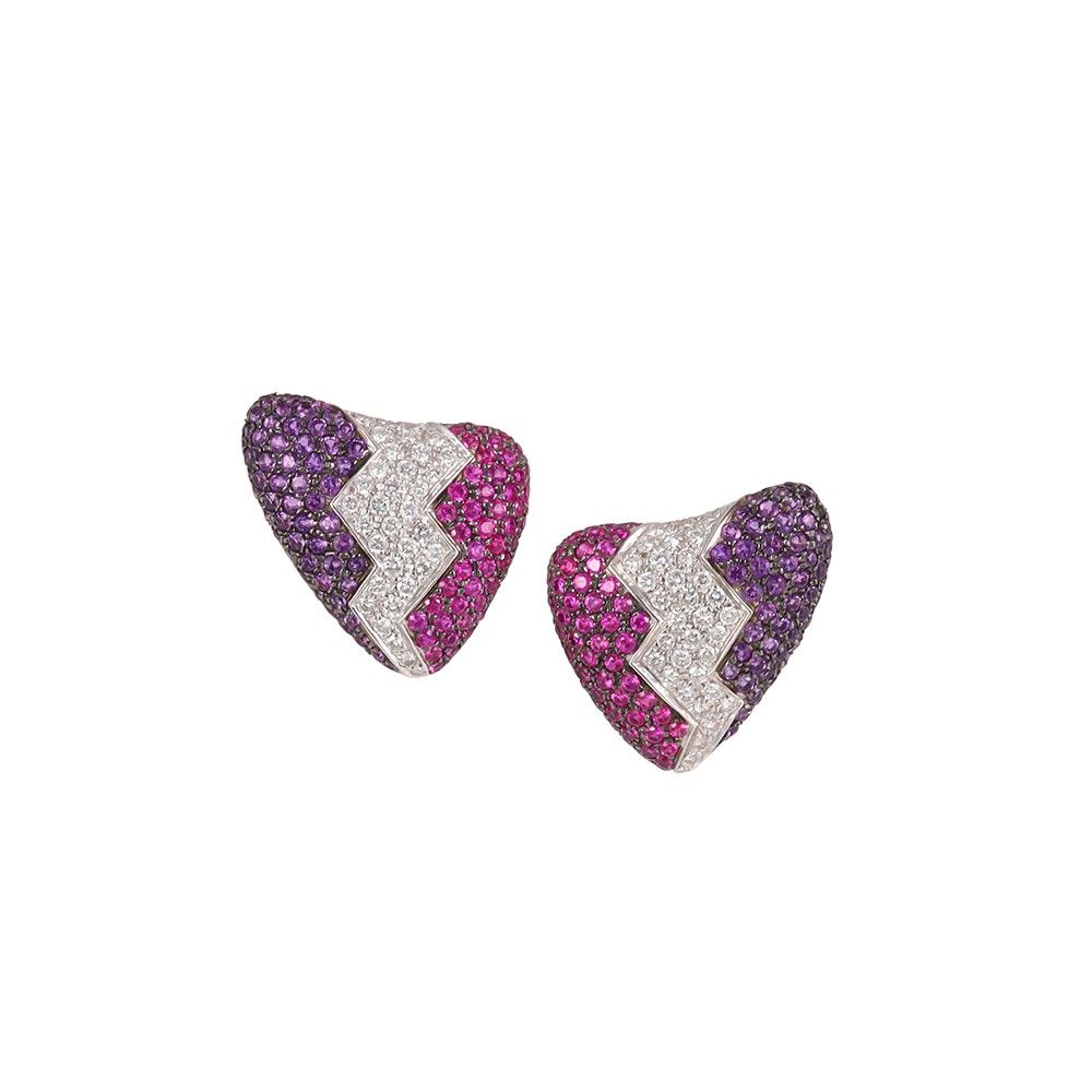 in oro bianco a forma stilizzata con motivo a saetta in pavé di brillanti, spinelli rossi e ametiste, gr. 20,2. Dimensioni 2,7 x 2,7 cm ca. Firmati: Gavello