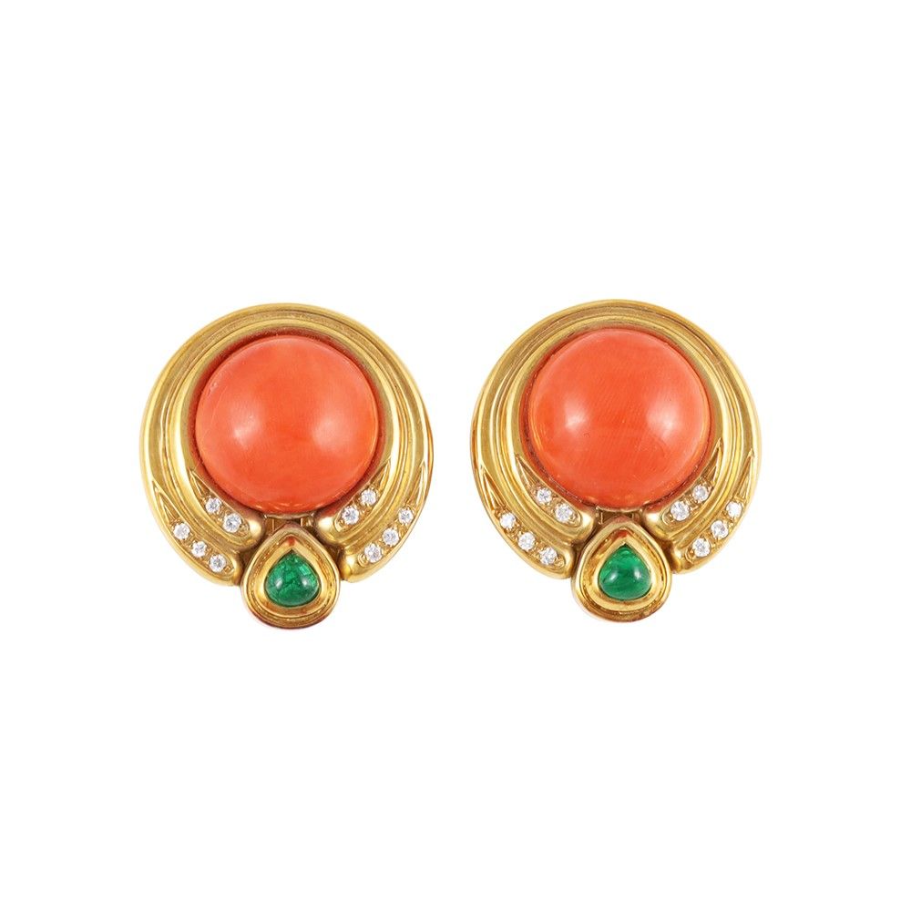 a forma circolare realizzati in oro giallo, ciascuno con corallo a bottone sormontato da uno smeraldo a goccia taglio cabochon e piccoli brillanti, gr. 33,5. Dimensioni 3 x 2,5 cm ca.