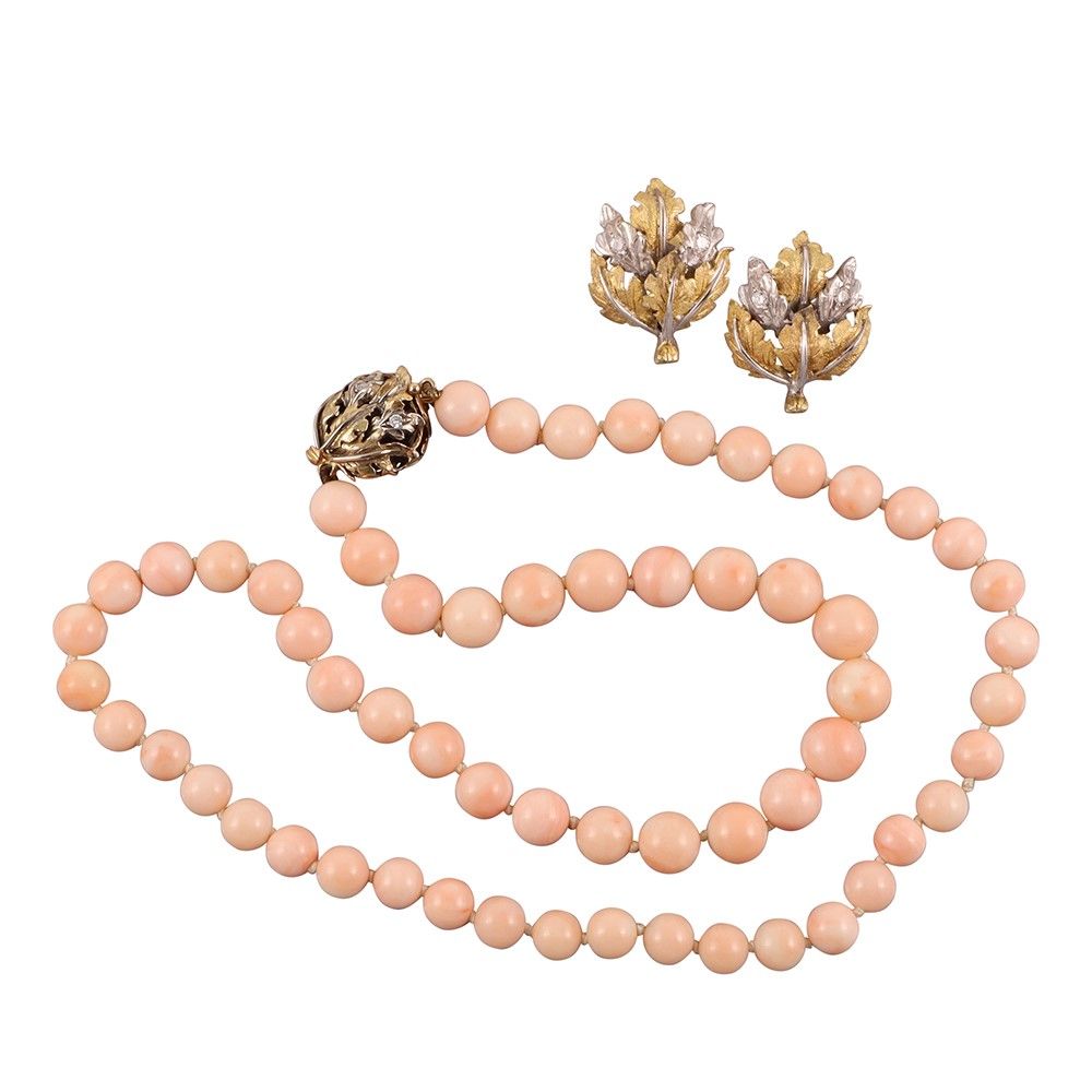 composta da collana a un filo di sfere di corallo rosa poste il leggera gradazione con chiusura in oro giallo e bianco a motivi fogliati ornata da brillanti e orecchini 'en suite', gr. 60 (collana), gr. 8,8 (orecchini). Lunghezza collana 57 cm, dimensioni orecchini 2,2 x 1,5 cm ca.