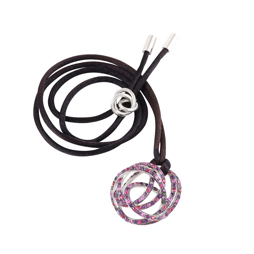 a motivo intrecciato, realizzato in oro bianco parzialmente brunito, ornato da gemme tra cui corindoni e ametiste, sostenuto da cordoncino in raso nero con chiusura in oro bianco, gr. 23,9., gr. 24 ca. Diametro pendente 3,2 cm ca., lunghezza cordoncino 63 cm ca. (regolabile) Firmato: de Grisogono Numerato: 05 B10082