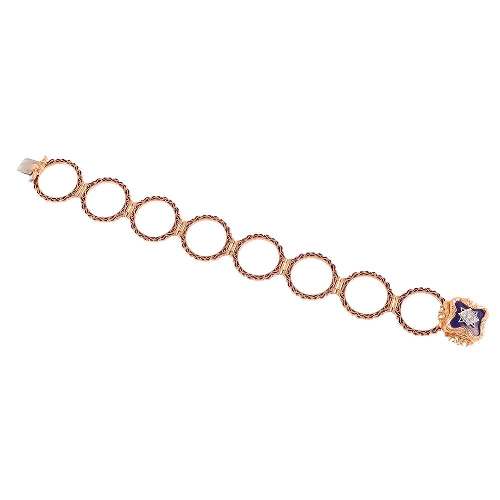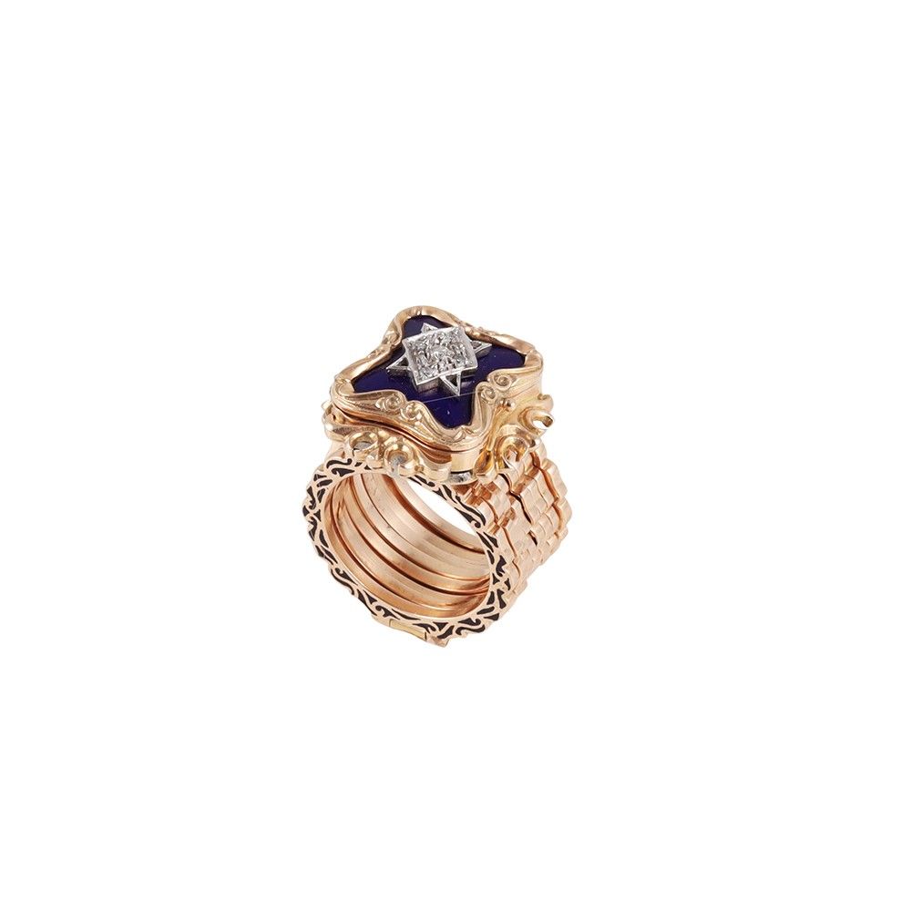 doppio uso, in oro a titolo basso, sormontato da scrigno portaritratto, ornato da brillanti e smalti. Il gambo è costituito da diversi anelli ripiegati che una volta aperti ne consentono l'utilizzo come bracciale, gr. 28,9. Misura anello 13 Lunghezza bracciale 20 cm