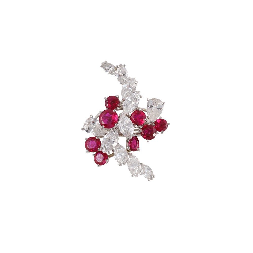in oro bianco sormontato da un sinuoso motivo, impreziosito da diamanti taglio navette e goccia del peso complessivo di 6 ct ca e da rubini del peso complessivo di 4,50 ct ca., gr. 17,3. Misura 21