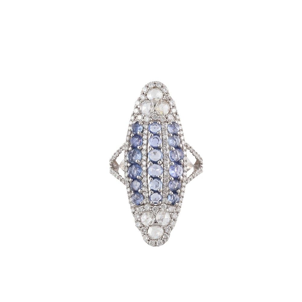 in oro bianco con grande motivo a navetta, impreziosito da zaffiri e diamanti taglio a rosa e ornato da piccoli brillanti, gr. 9,2. Misura 15