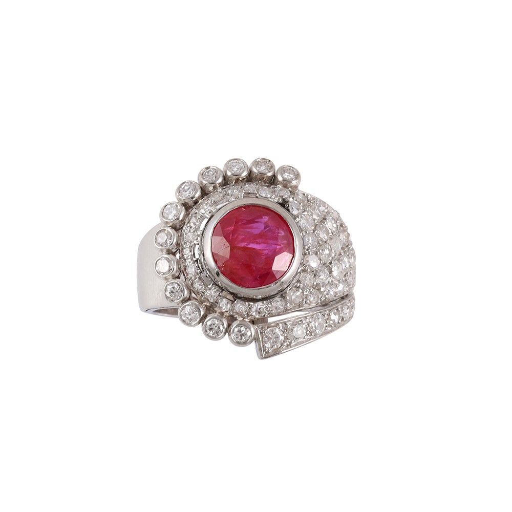 in platino a fascia in pavé di diamanti e rubino tondo centrale del peso di 2,20 ct ca., gr. 10,2. Misura 16
