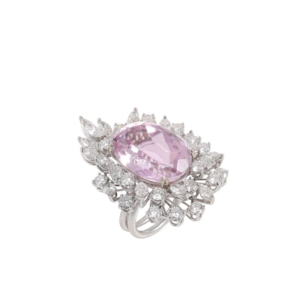in oro bianco, con morganite ovale del peso di 18 ct ca., contornata da brillanti e diamanti taglio navette del peso complessivo di 4,30 ct ca., gr. 26,4. Misura 13