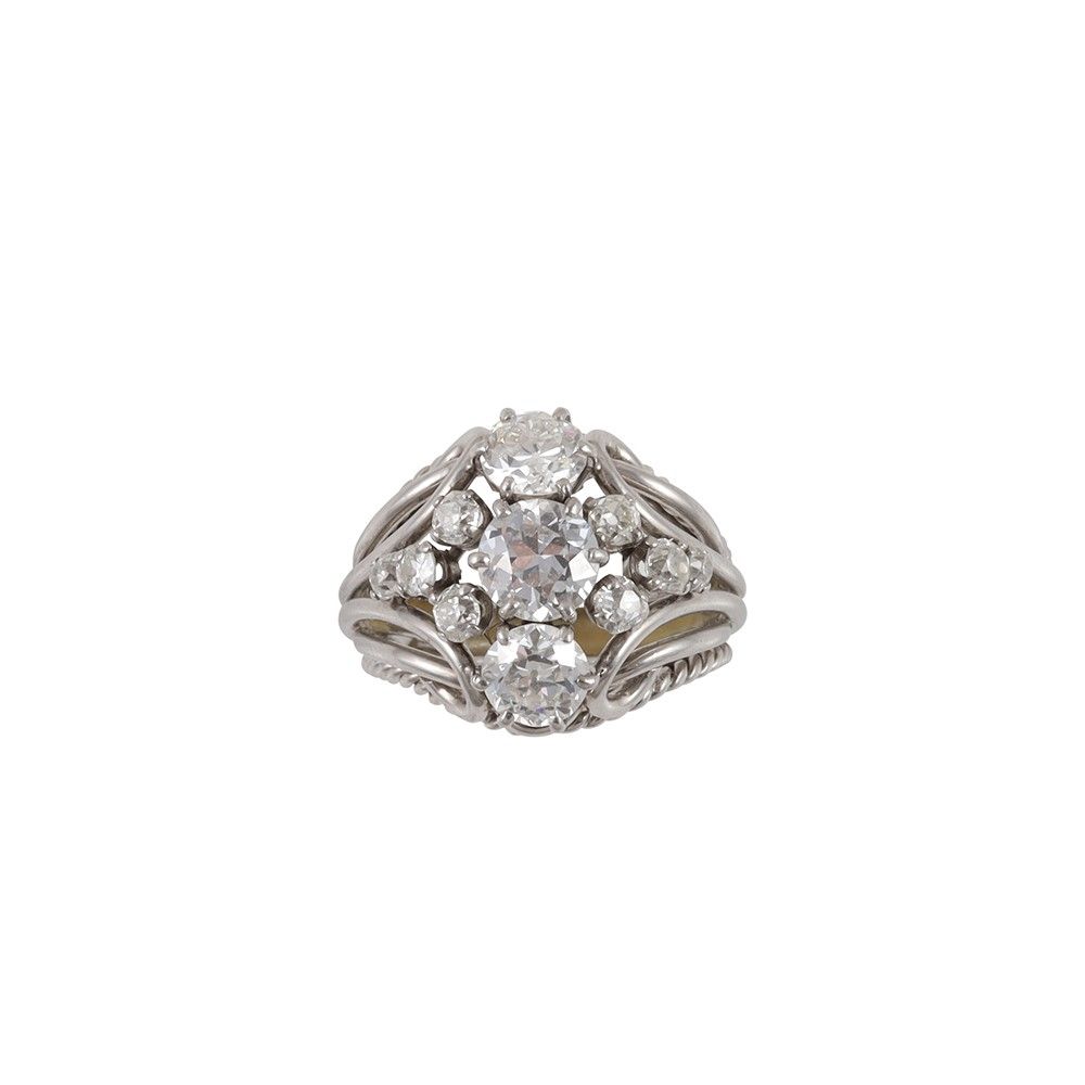 in platino, a cupola ornato da diamanti taglio antico europeo, di cui tre di dimensioni maggiori posti al centro del peso complessivo di 2,30 ct ca., gr. 16. Misura 16
