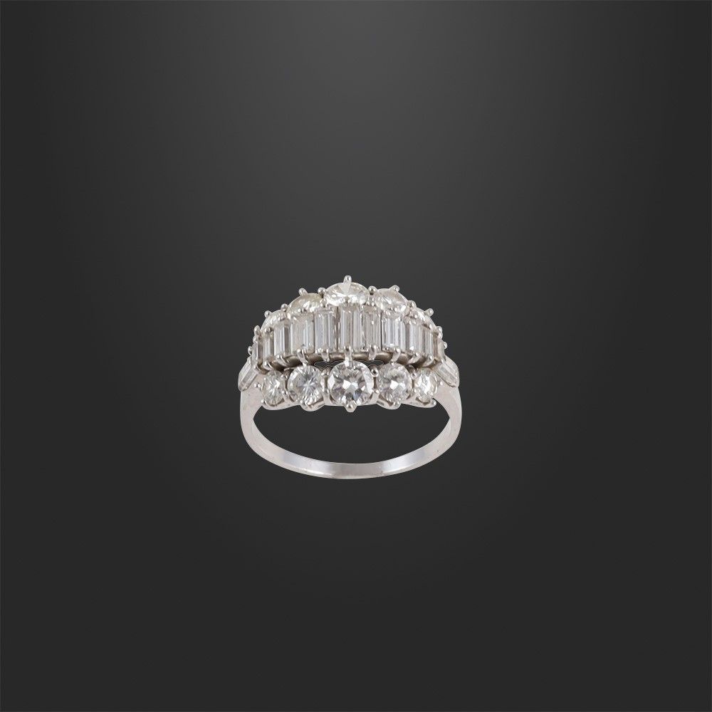 in oro bianco con parte superiore ornata da brillanti e diamanti taglio baguette disposti a rivière del peso complessivo di 3 ct ca., gr. 6,1. Misura 22