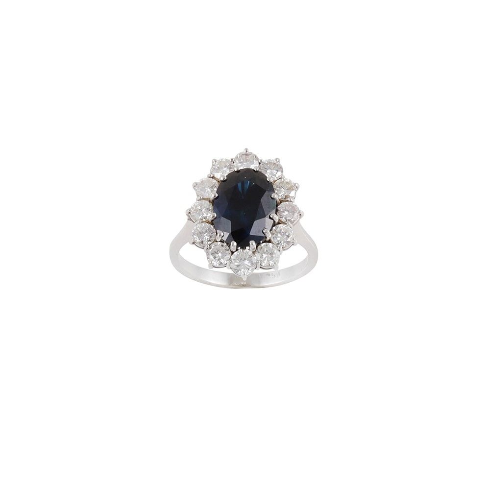 in oro bianco con zaffiro ovale contornato da brillanti del peso complessivo di 1,40 ct ca., gr. 4,8. Misura 14