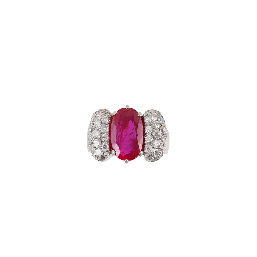 in platino a fascia con rubino ovale del peso di 4,31 ct posto al centro affiancato da motivi bombati in pavé di diamanti, gr. 10,7. Misura 14,5 Analisi gemmologica n. GRS2023-017727 del 18/01/2023, rilasciata dal laboratorio GRS di Meggen, attestante che il rubino č di provenienza Myanmar e non ha subito trattamento termico