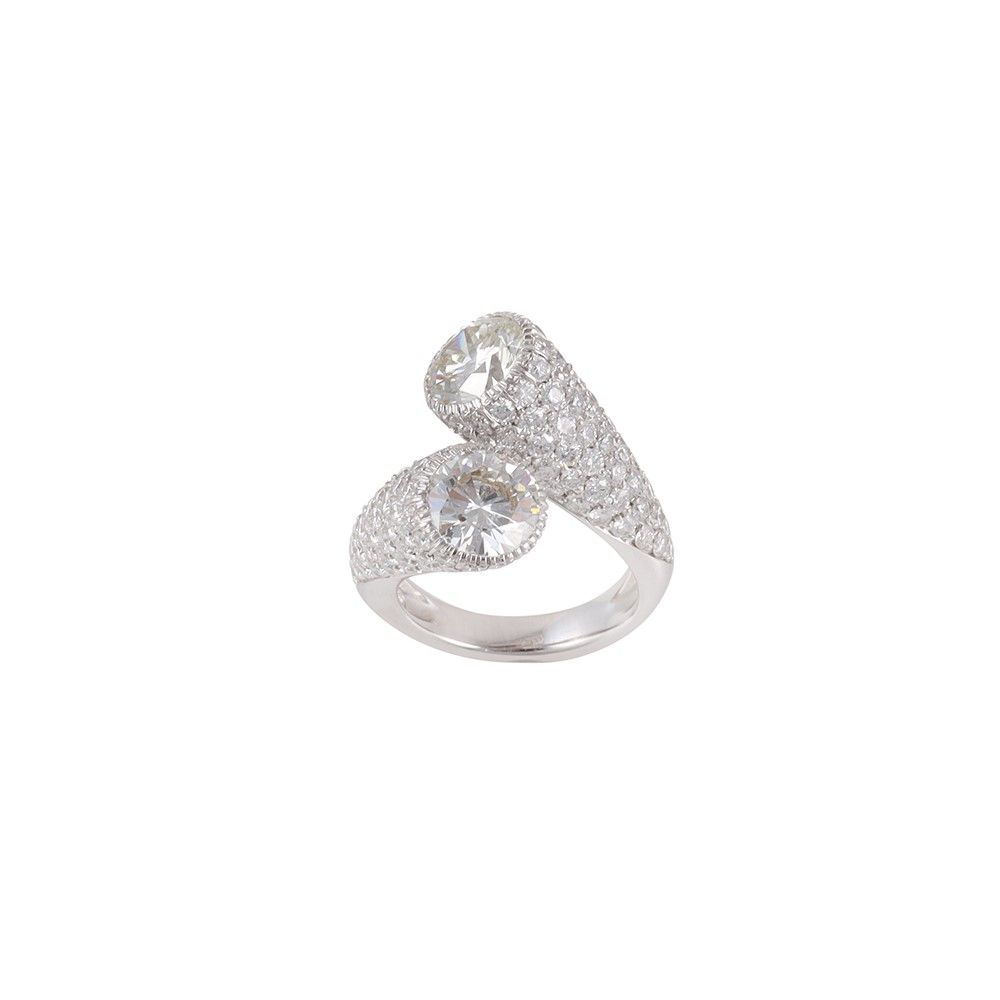 contrarié in oro bianco con due brillanti del peso complessivo di 3,40 ct ca., impreziosito da brillanti in pavé del peso complessivo di 5 ct ca., gr. 16,4. Misura 18 Firmato: Scavia