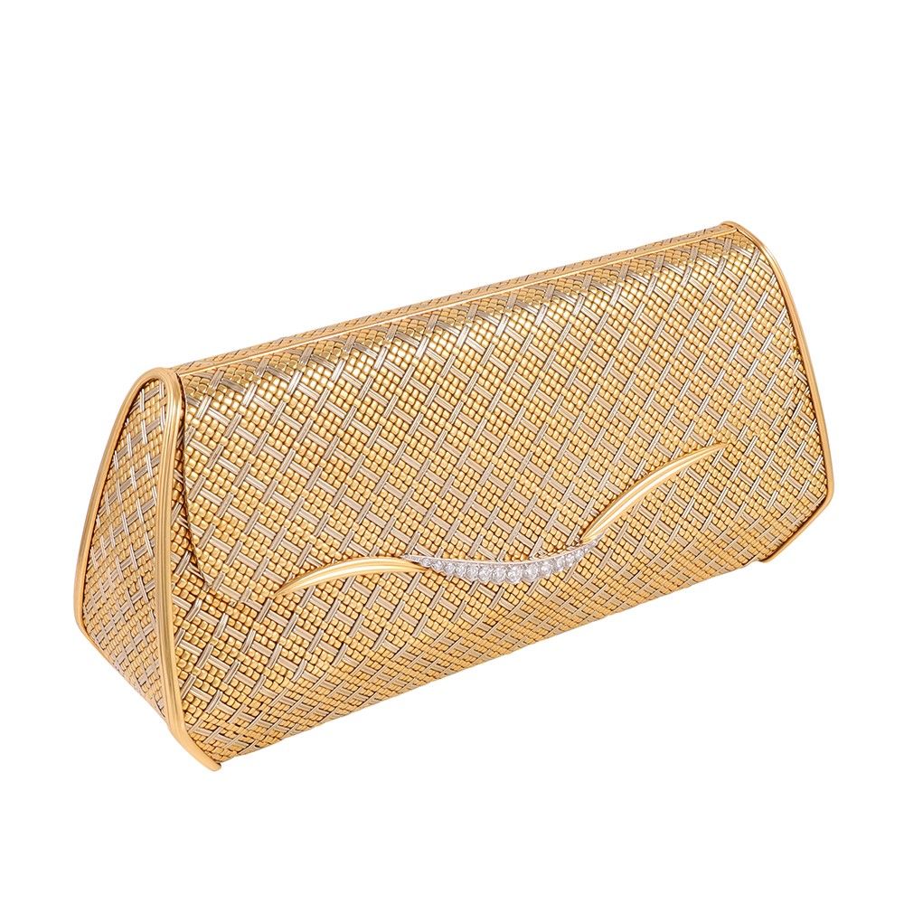 in oro a lavorazione intrecciata, con chiusura in platino e brillanti, specchio all'interno, gr. lordi 514. Dimensioni 19 x 9 x 5,5 cm ca. Marcata: CIF 843